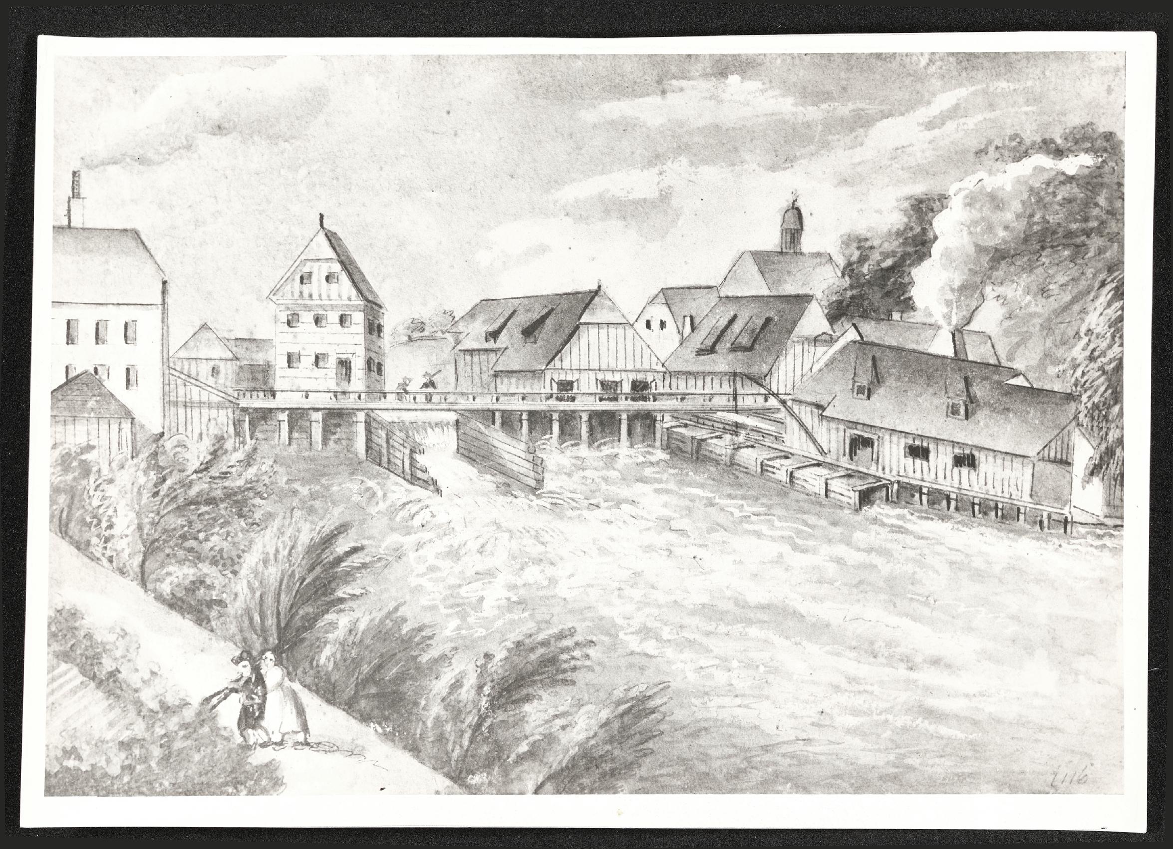 | Beschreibung | Zeichnung, Ansicht (vor 1914) der ersten Zeugstätte am Fluss Steyr im Wehrgraben in Steyr mit Schleifen, Drahtzug, Mühle, Papiermühle,Hammerwerk |