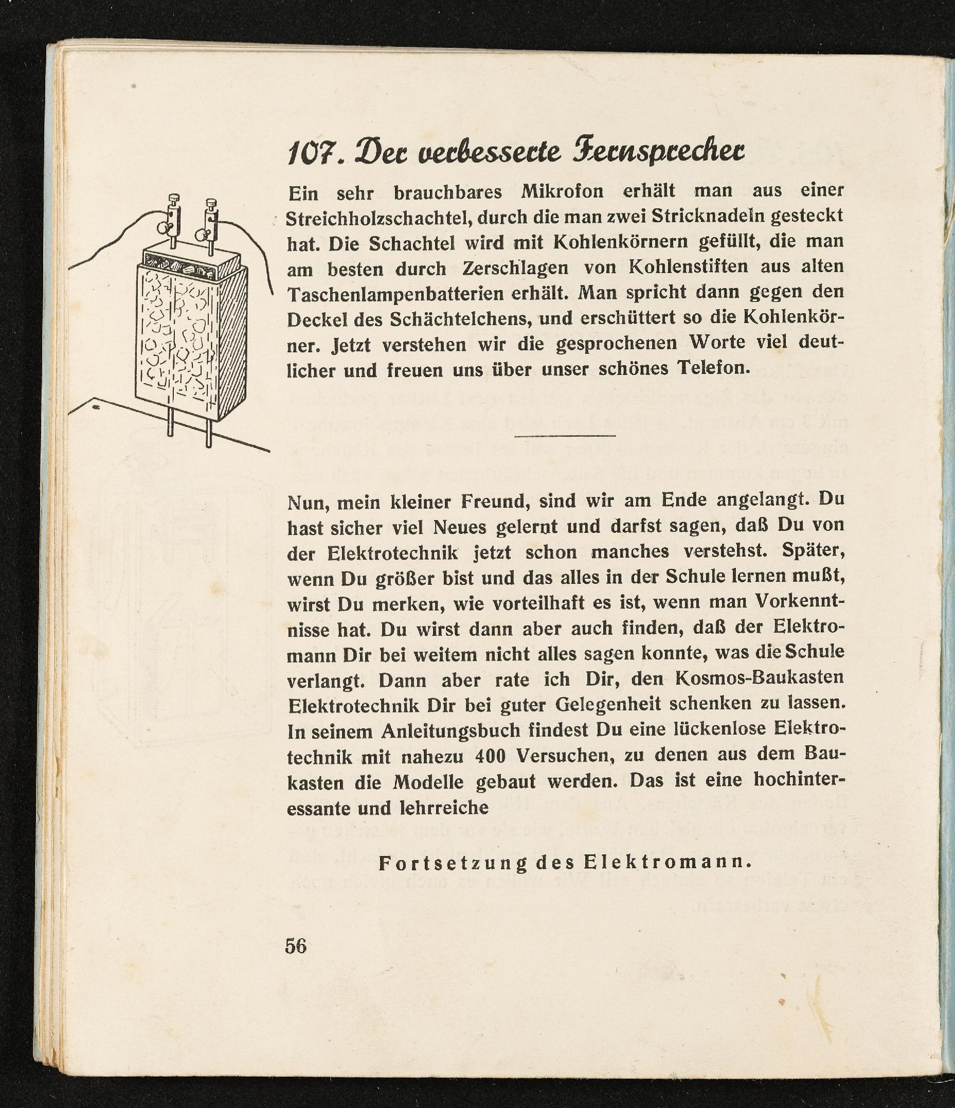 | Beschreibung | Elektrobaukasten Elektromann 1939, Lehrspielzeug der Firma Kosmos, Gesellschaft für Naturfreunde, Franck'sche Verlagshandlung, Gebrauchsanleitung, Schau, was der Elektromann alles aus sich machen kann, 100 elektronische Versuche für kleine Leute, von Wilhelm Fröhlich |