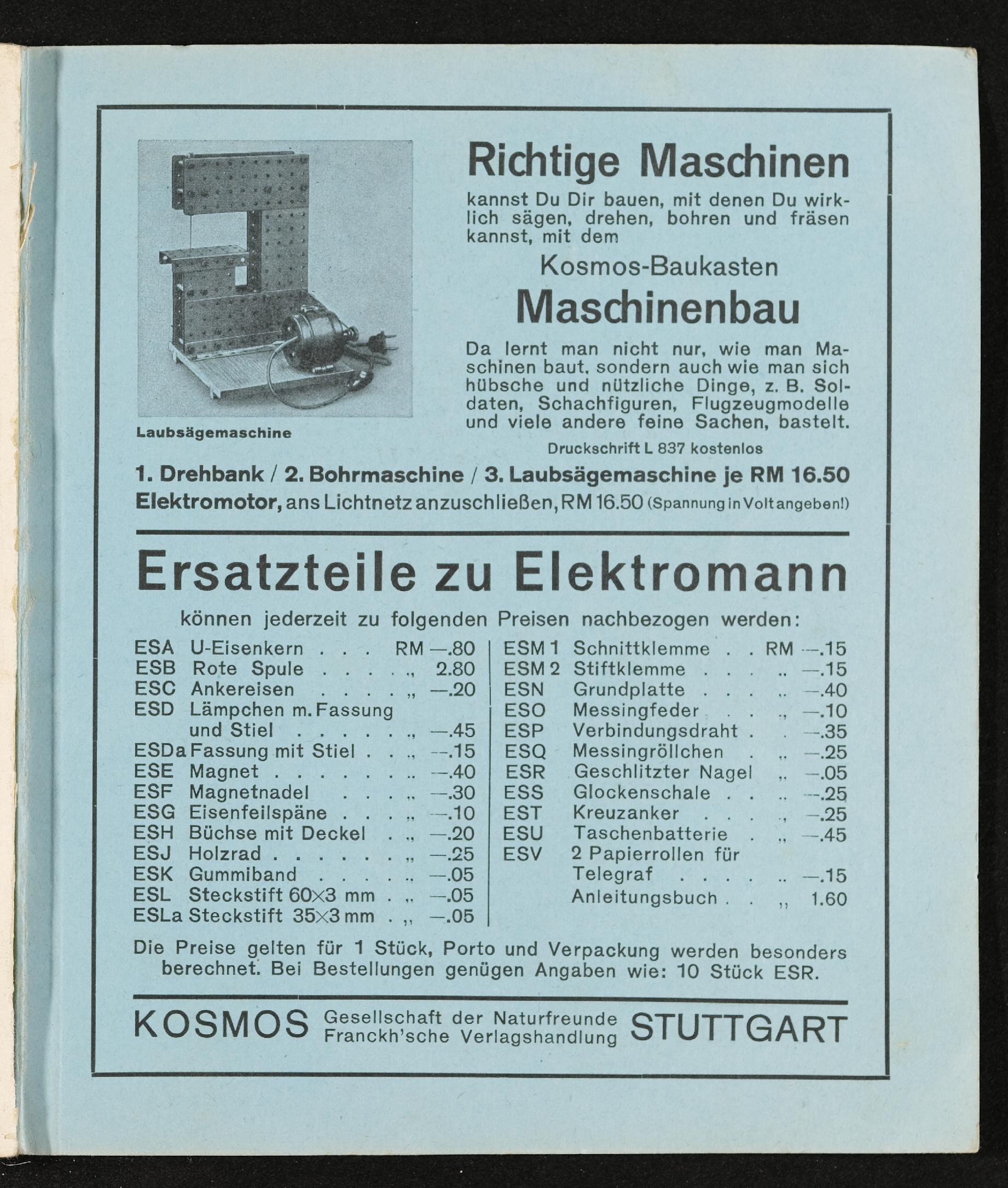 | Beschreibung | Elektrobaukasten Elektromann 1939, Lehrspielzeug der Firma Kosmos, Gesellschaft für Naturfreunde, Franck'sche Verlagshandlung, Gebrauchsanleitung, Schau, was der Elektromann alles aus sich machen kann, 100 elektronische Versuche für kleine Leute, von Wilhelm Fröhlich |