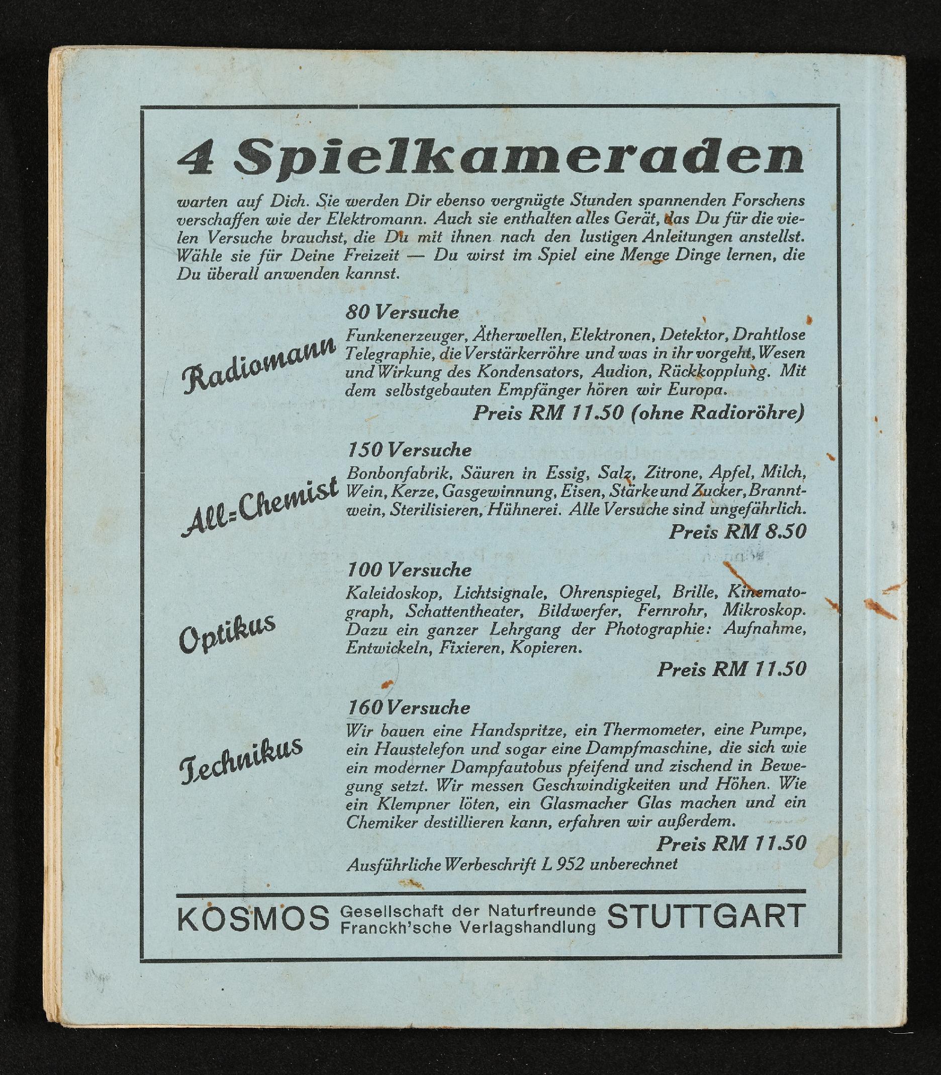 | Beschreibung | Elektrobaukasten Elektromann 1939, Lehrspielzeug der Firma Kosmos, Gesellschaft für Naturfreunde, Franck'sche Verlagshandlung, Gebrauchsanleitung, Schau, was der Elektromann alles aus sich machen kann, 100 elektronische Versuche für kleine Leute, von Wilhelm Fröhlich |