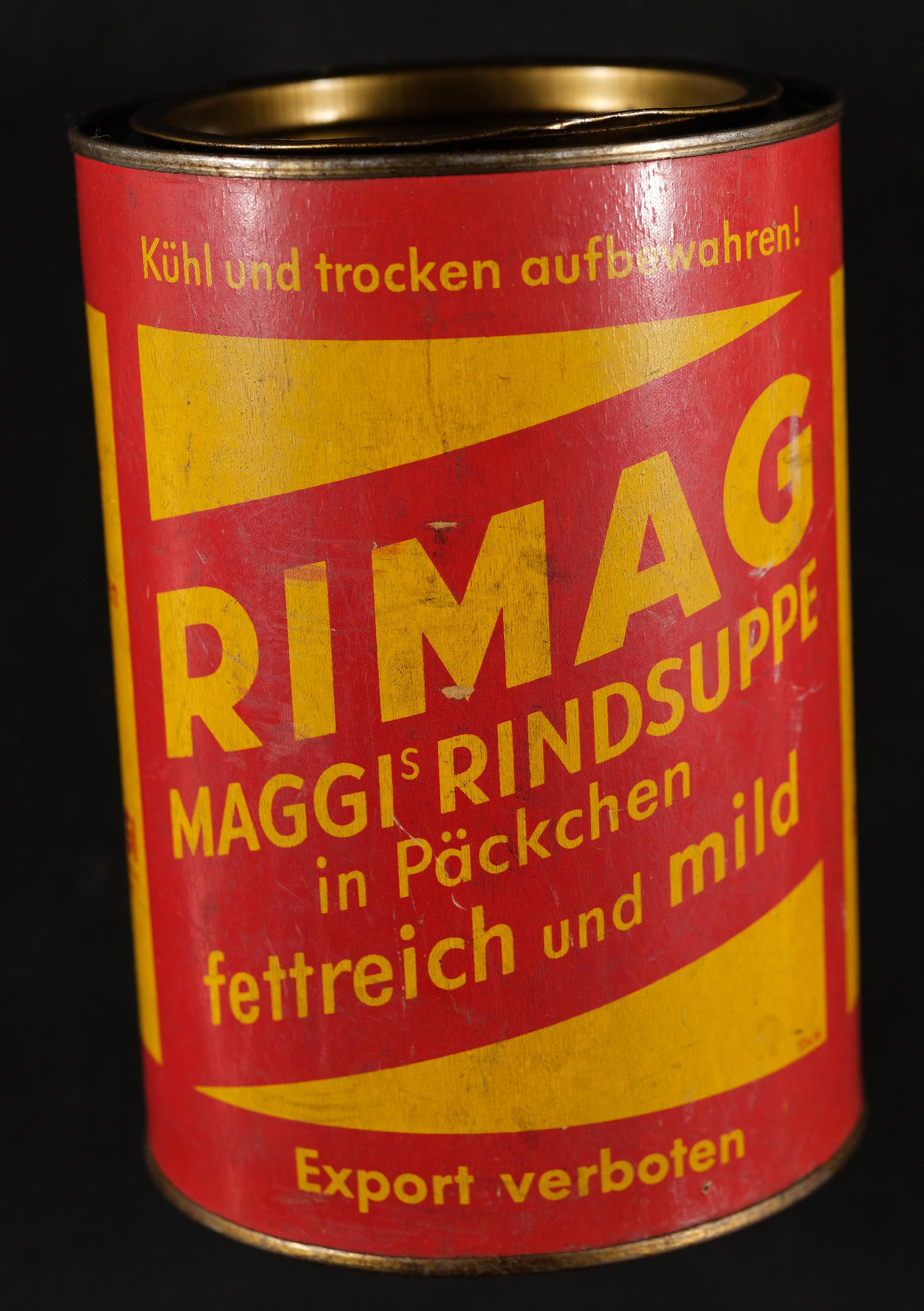 Blechdose der Firma Maggi Gesellschaft m.b.H. Wien-Bregenz, Aufschrift RIMAG Maggi's Rindsuppe in Päckchen, Inhalt 100 Päckchen, Ansicht mit Deckel |