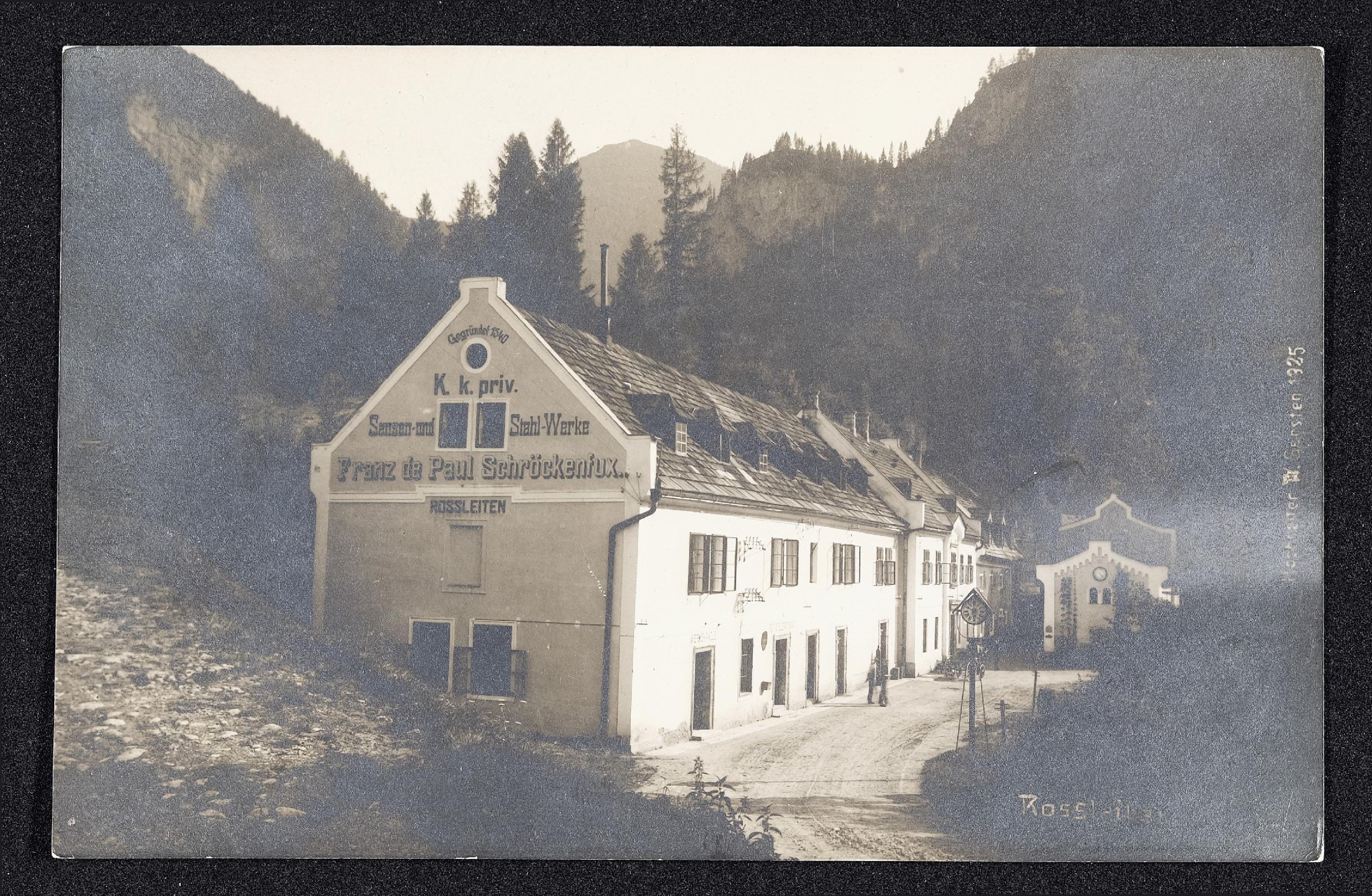| Beschreibung | Gebäudeansicht der Sensen- und Stahlwerke Franz de Paul Schröckenfux |