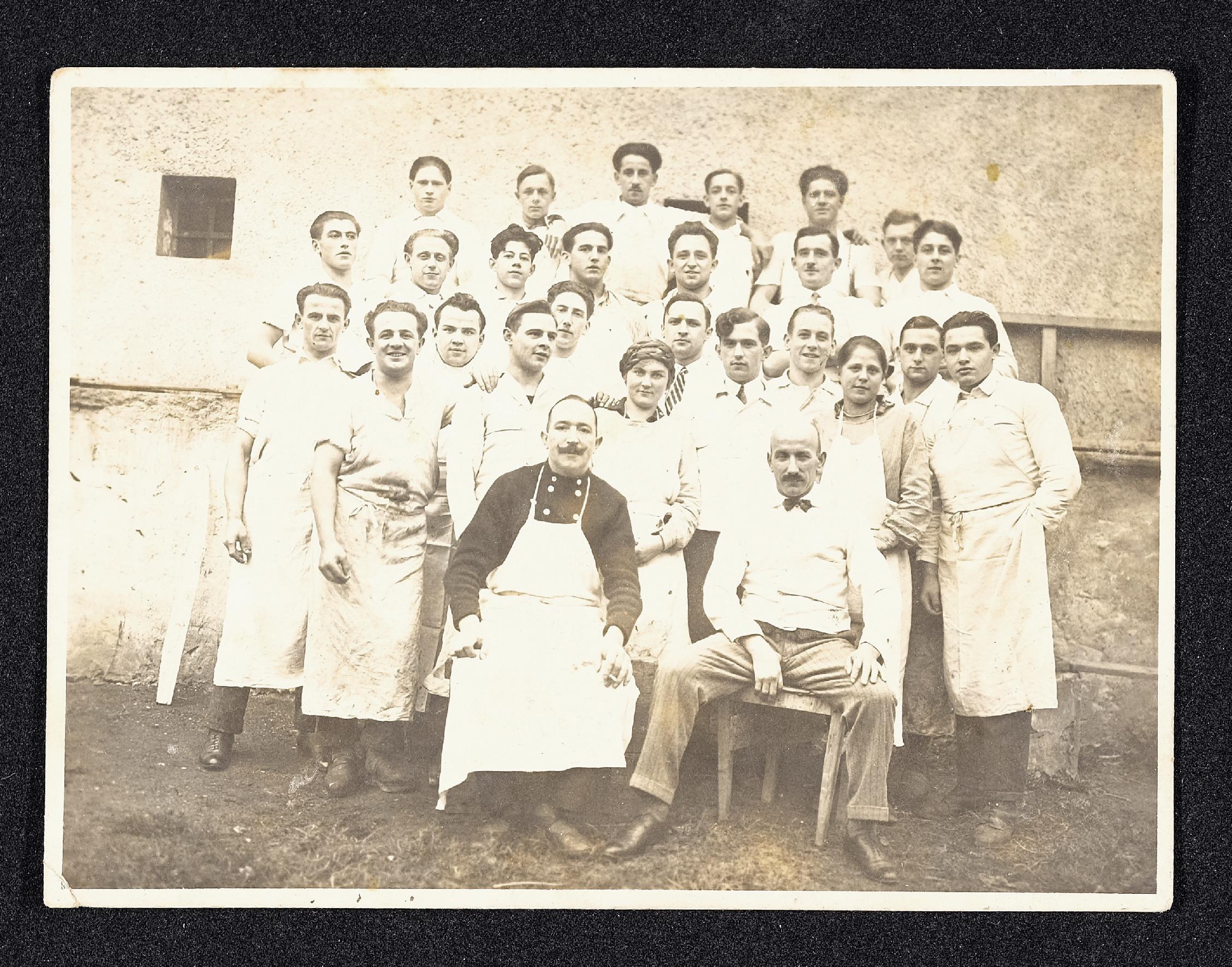 | Beschreibung | Gruppenbild Fleischergesellen mit zwei Arbeiterinnen, die alle eine Schürze tragen |
