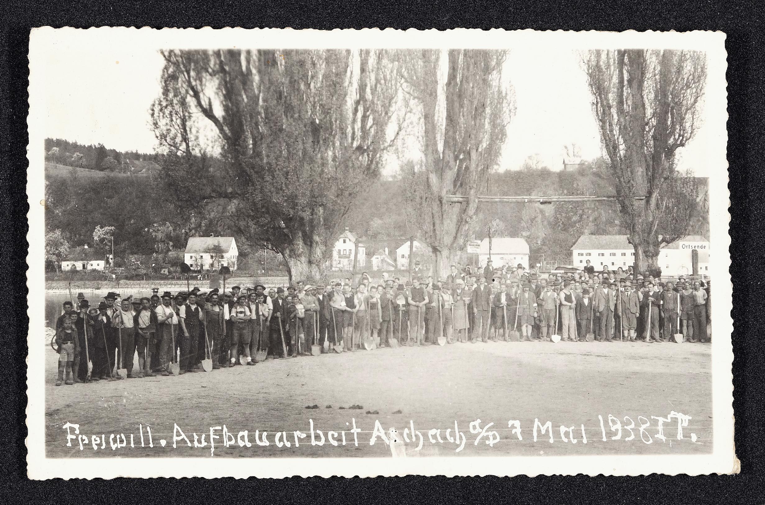 | Beschreibung | Gruppenfoto Männer mit Schaufeln bei der freiwilligen Aufbauarbeit Ortsverschönerung |