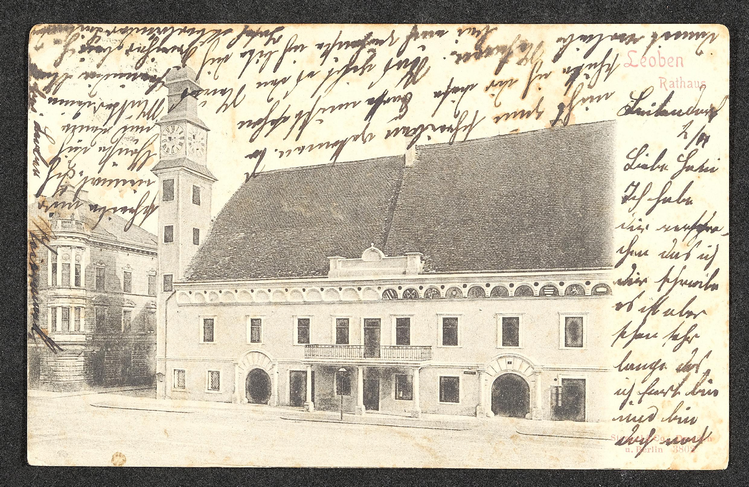 | Beschreibung | Ansichtskarte mit Motiv Leoben, Rathaus, und persönlicher Nachricht |
