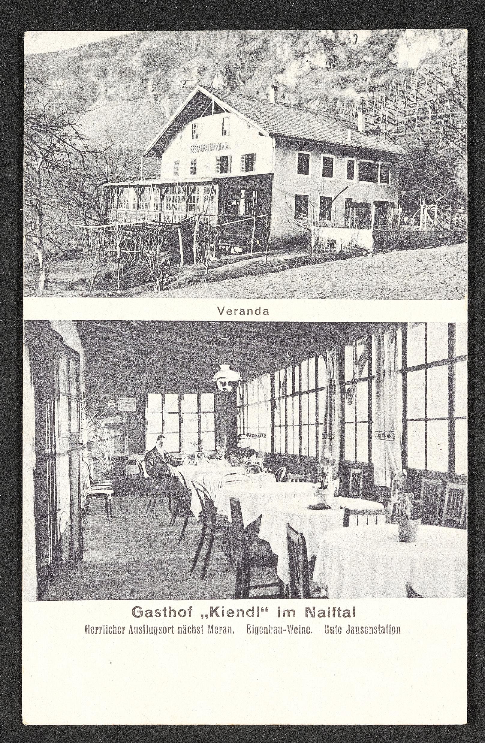 | Beschreibung | Ansichtskarte mit Motiv Meran, Gasthof "Kiendl" im Naiftal und persönlicher Nachricht |