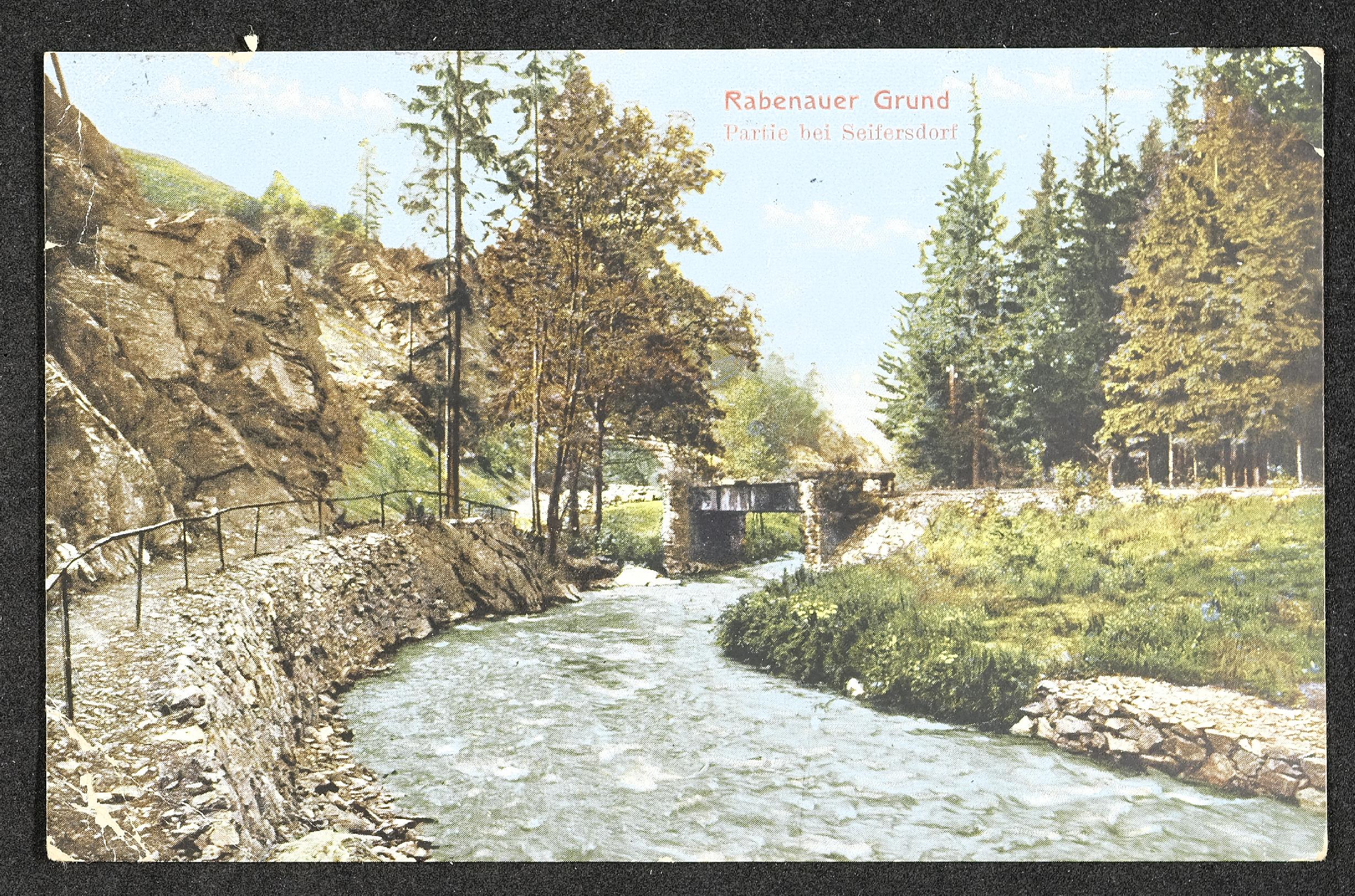 | Beschreibung | Ansichtskarte mit Motiv Rabenauer Grund - Partie bei Seifersdorf und persönlicher Nachricht |