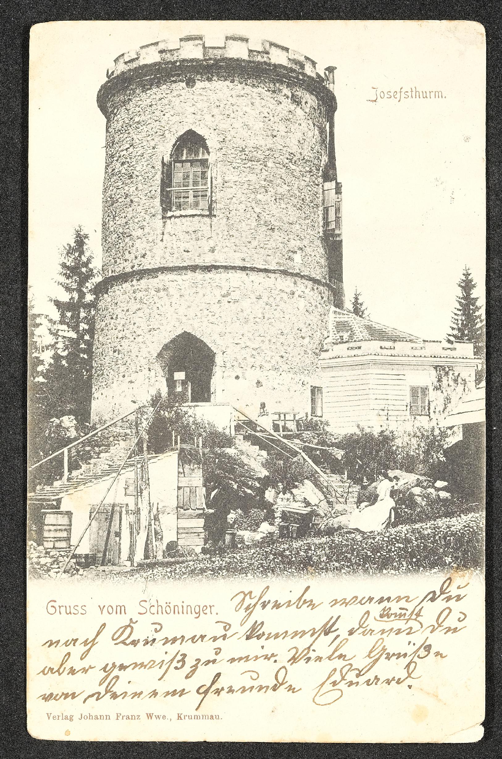 | Beschreibung | Ansichtskarte mit Motiv Josefsthurm, Gruss vom Schöninger und persönlicher Nachricht |
