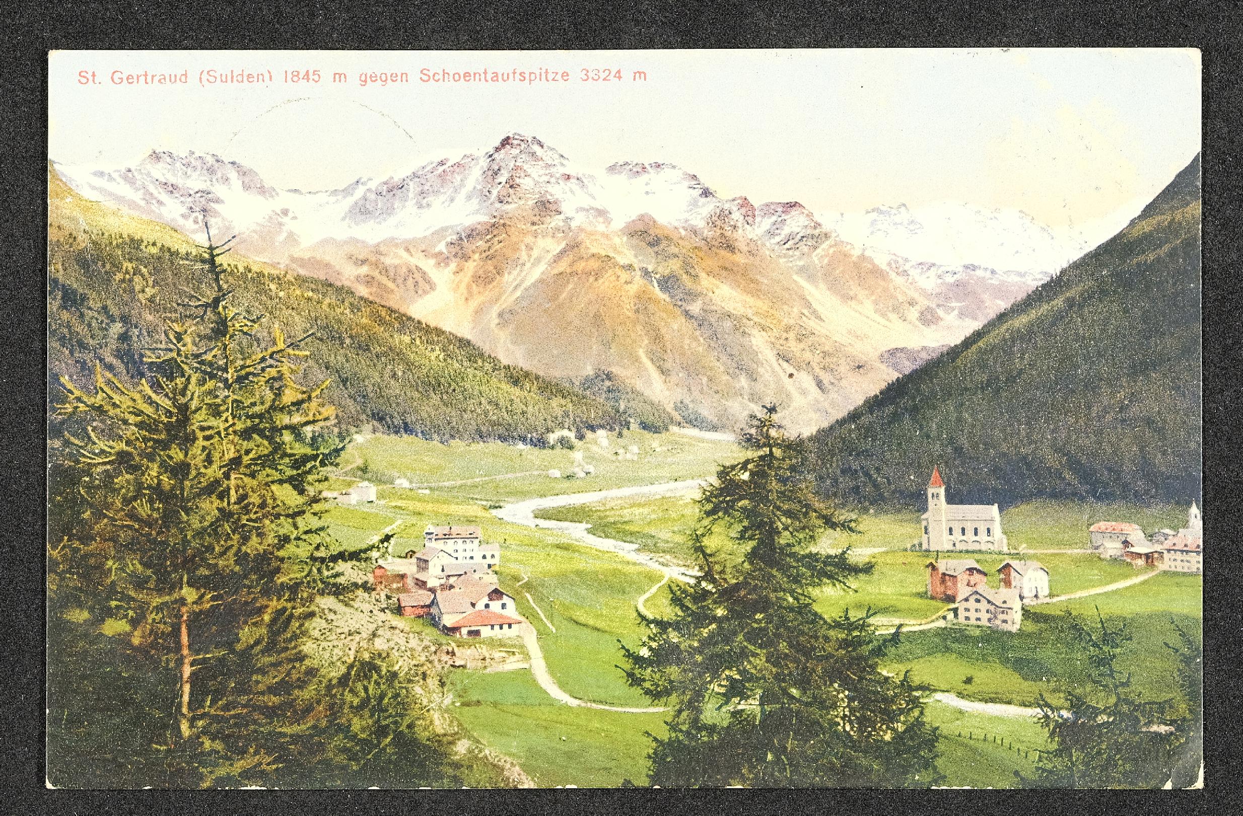 | Beschreibung | Ansichtskarte mit Motiv St. Gertraud (Sulden) gegen Schoentaufspitze und persönlicher Nachricht |