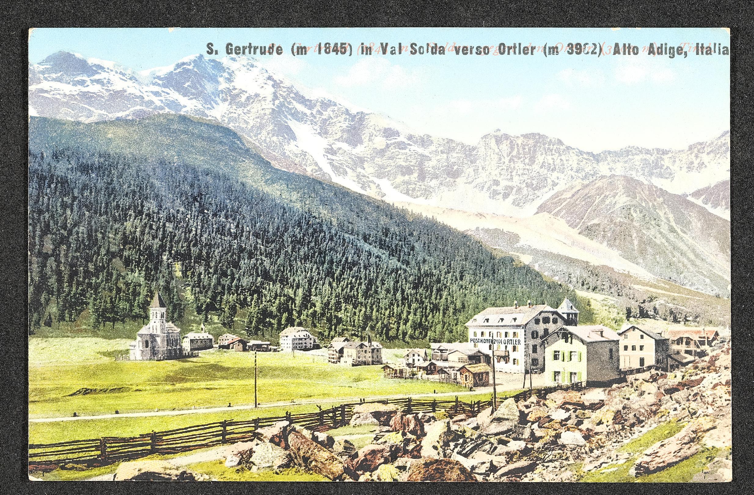 | Beschreibung | Ansichtskarte mit Motiv St. Gertrude in Val Solda verso Ortler, Alto Adige, Italia, und persönlicher Nachricht |