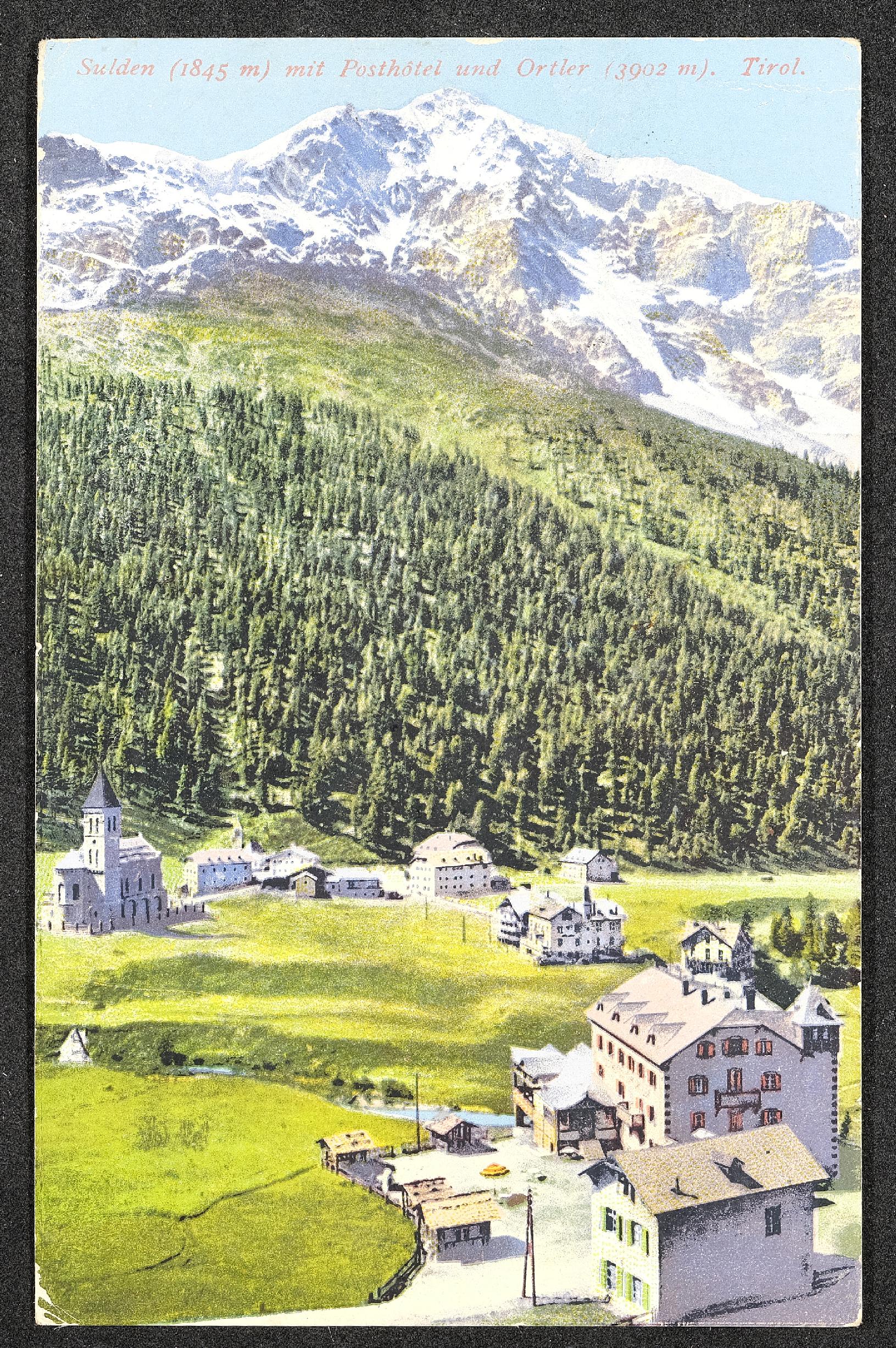 | Beschreibung | Ansichtskarte mit Motiv Sulden mit Posthotel und Ortler, Tirol, und persönlicher Nachricht |