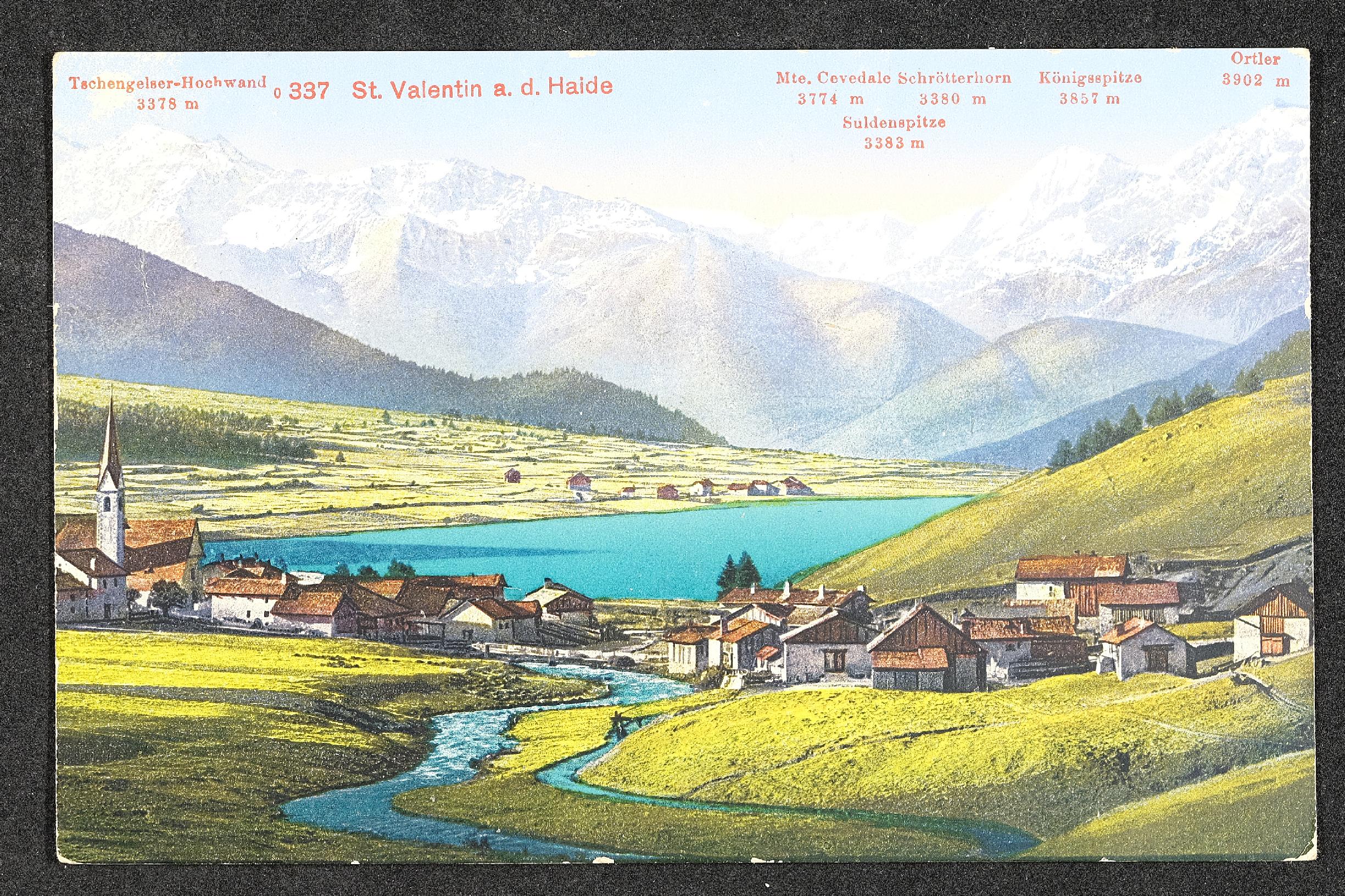 | Beschreibung | Ansichtskarte mit Motiv St. Valentin auf der Haide, Tschengelser Hochwand, Mte. Cevedale, Ortler, und persönliche Nachricht |