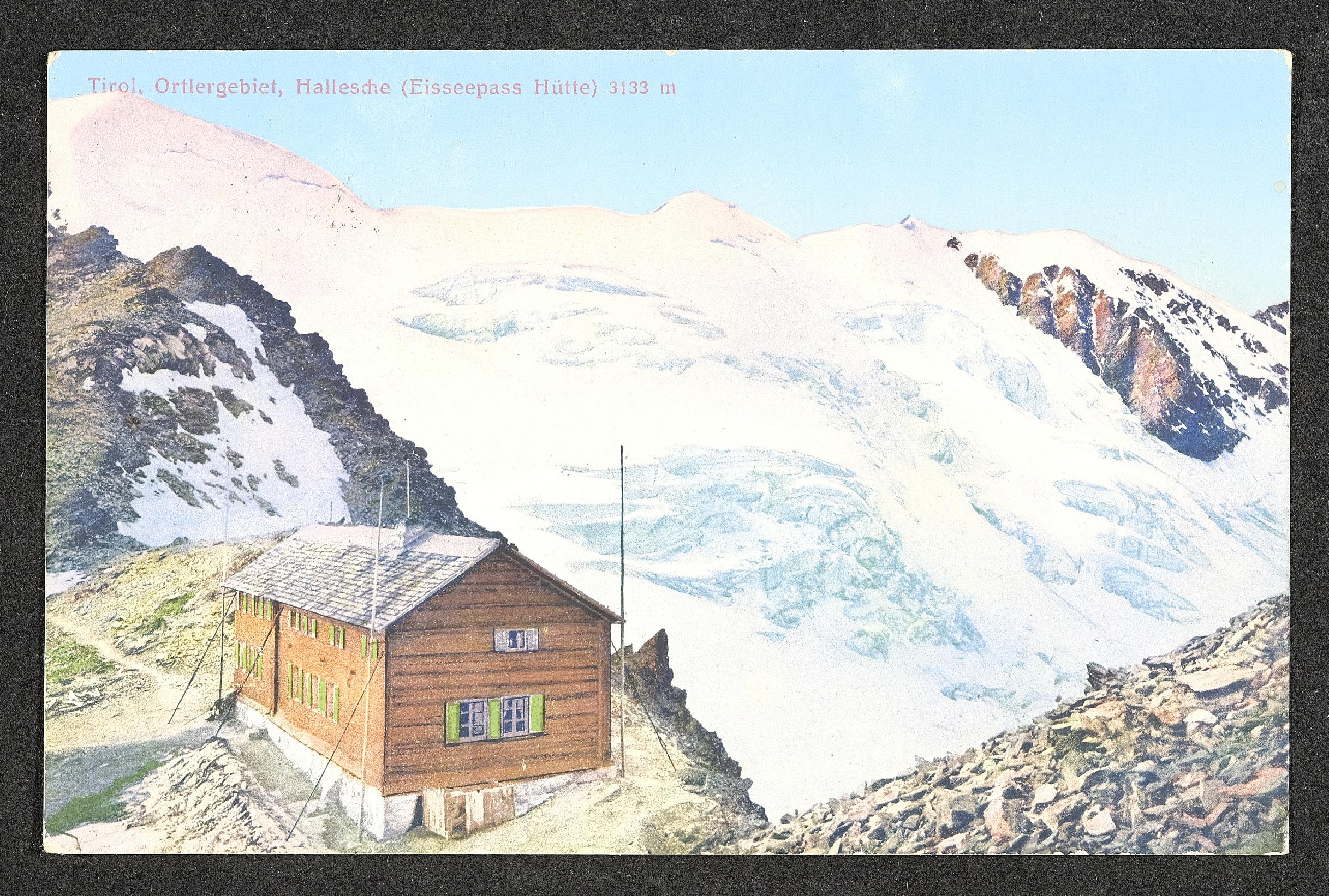 | Beschreibung | Ansichtskarte mit Motiv Tirol, Ortlergebiet, Hallesche (Eisseepass Hütte), und persönlicher Nachricht |