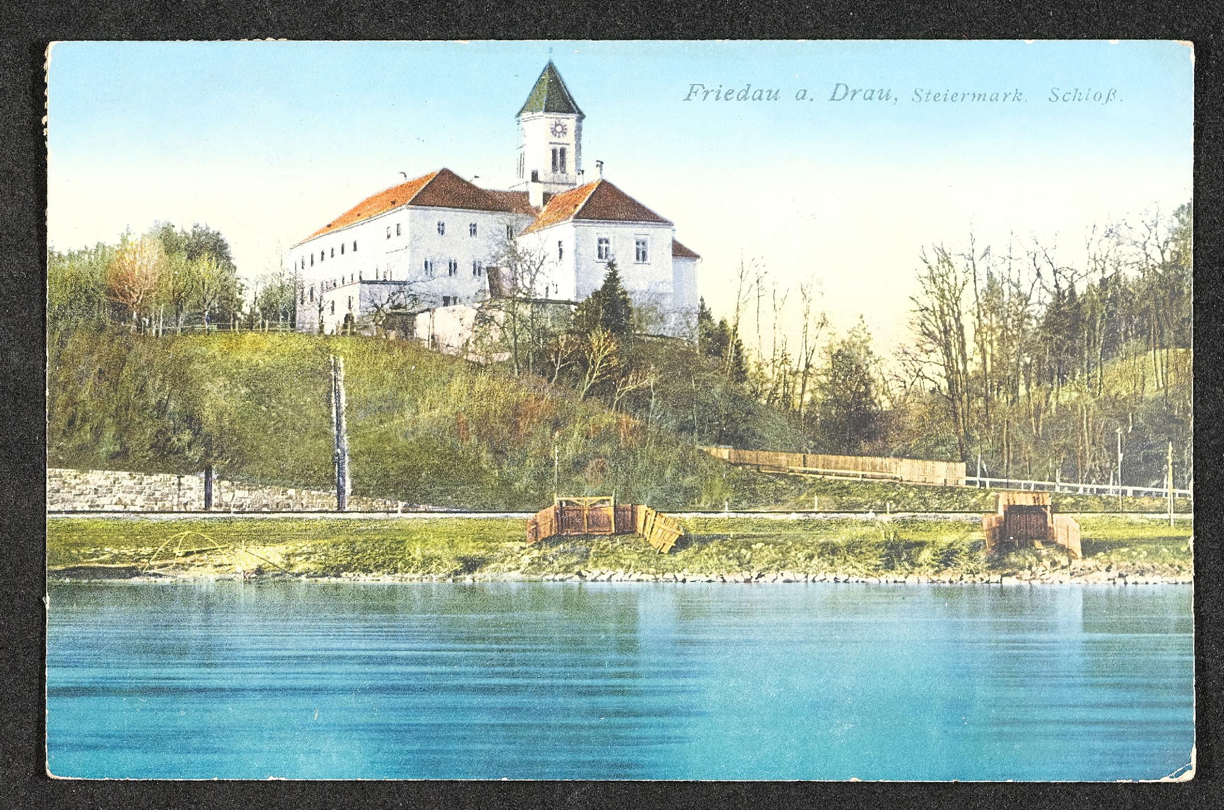 | Beschreibung | Ansichtskarte mit Motiv Friedau a. Drau, Steiermark, Schloss, und persönliche Nachricht |