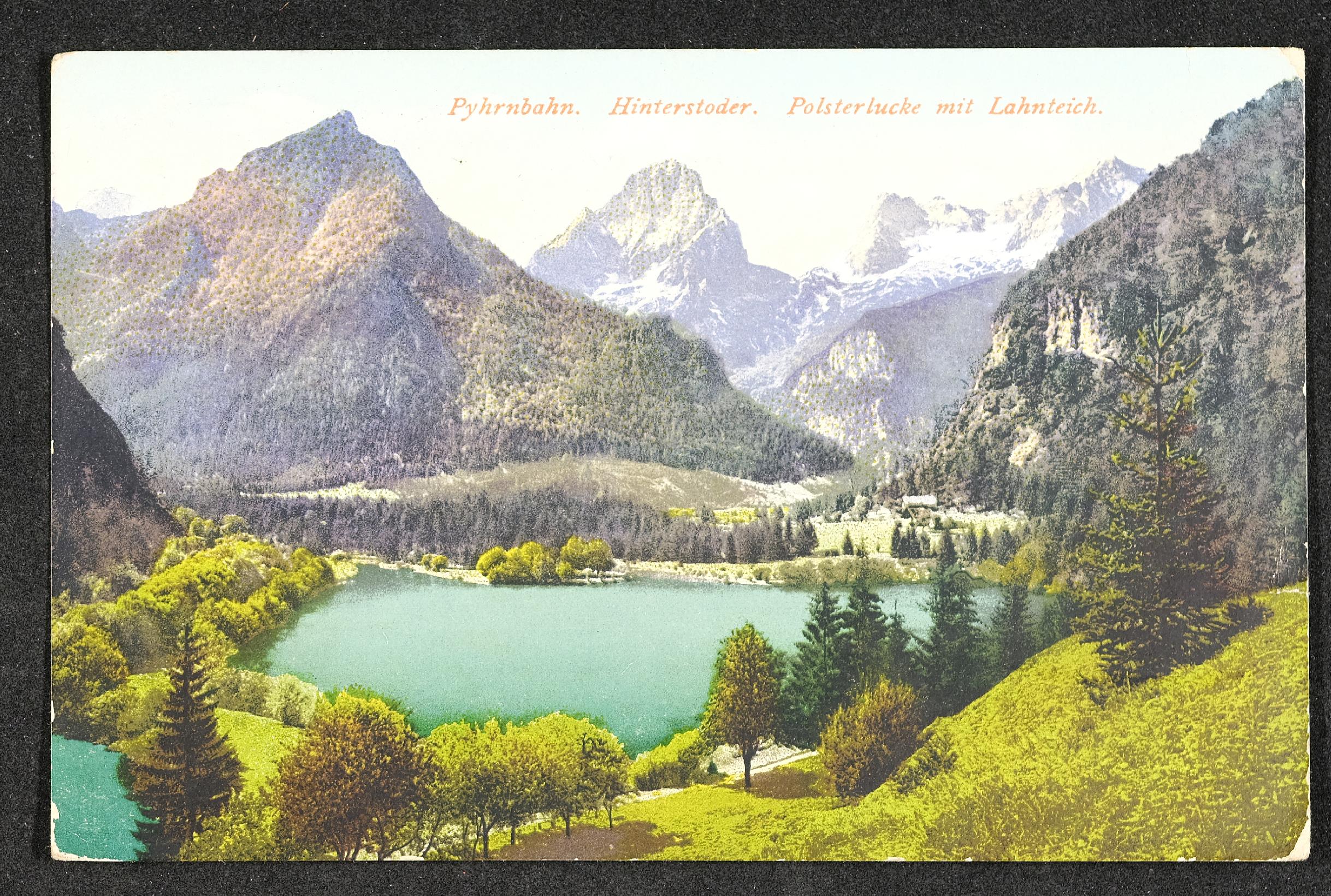 | Beschreibung | Ansichtskarte mit Motiv Pyhrnbahn, Hinterstoder, Polsterlucke mit Lahnteich, Feldpost 627, und persönlicher Nachricht |