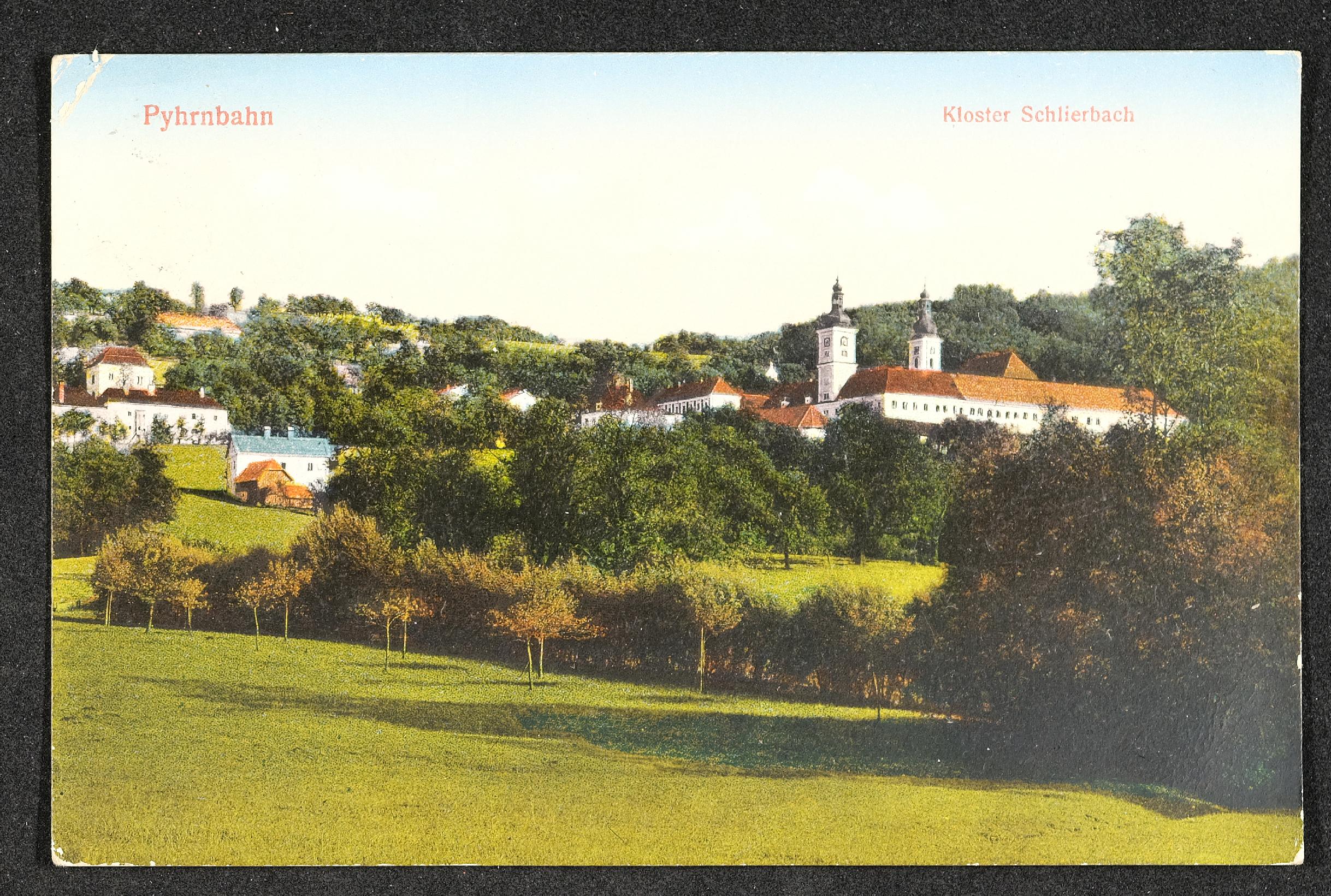 | Beschreibung | Ansichtskarte mit Motiv Pyhrnbahn, Kloster Schlierbach, und persönlicher Nachricht |
