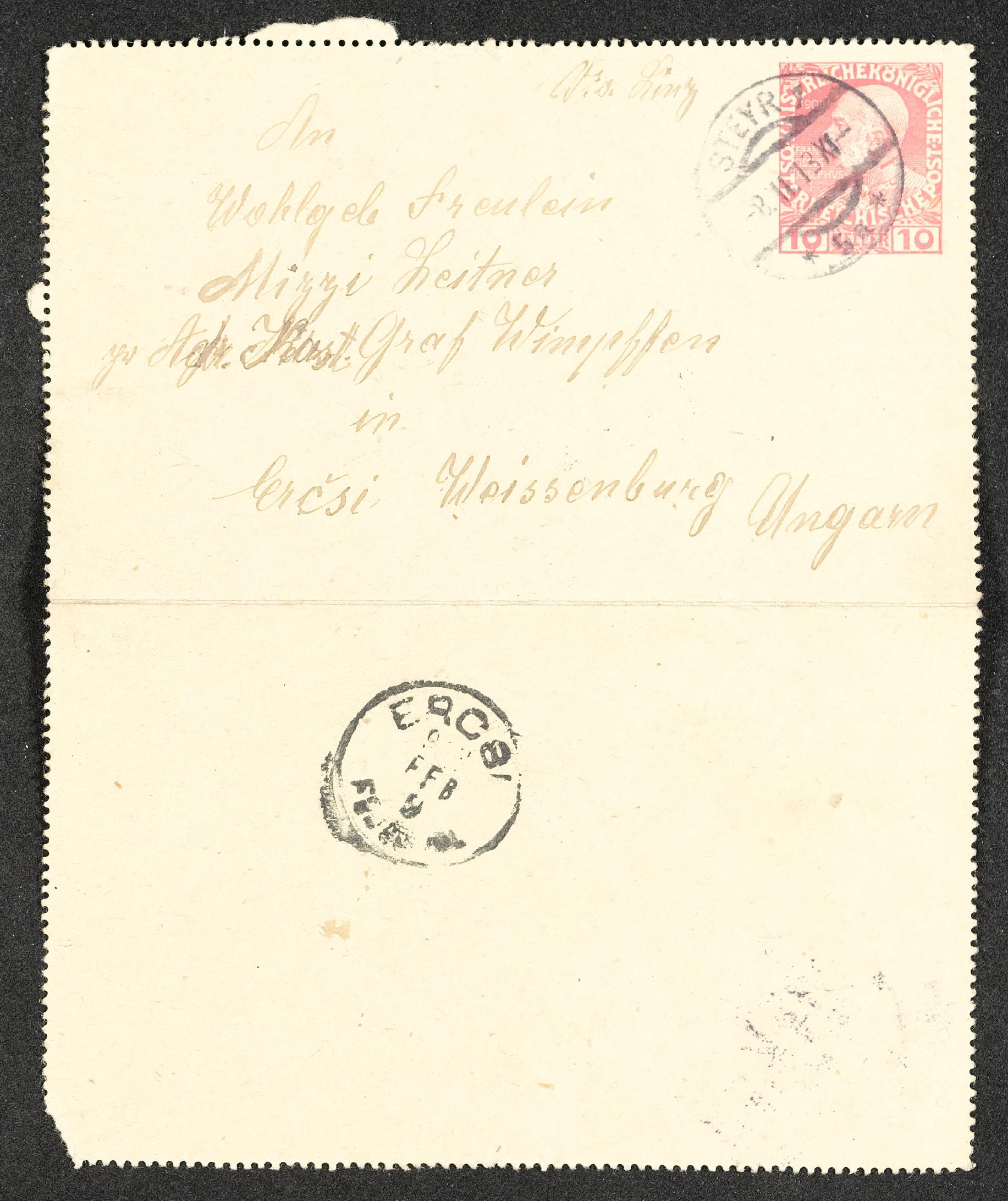 | Beschreibung | Brief an Mizzi Leitner in Ercsi aus Steyr von 1913 |