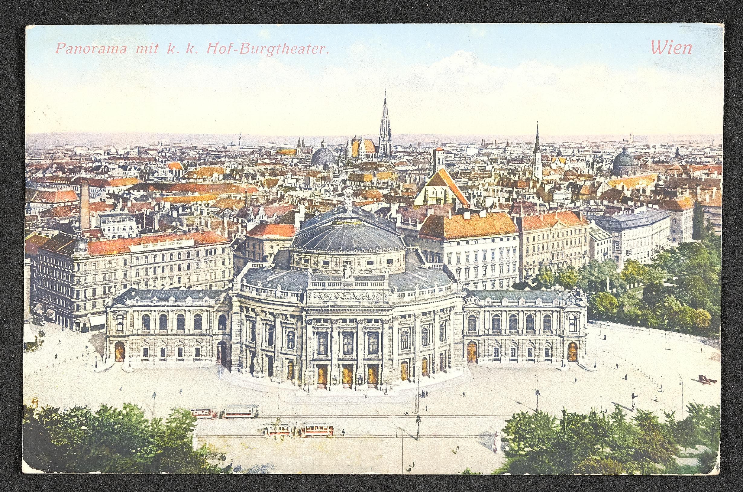 | Beschreibung | Ansichtskarte mit Motiv Wien, Panorama mit k. k. Hof-Burgtheater, und persönlicher Nachricht |