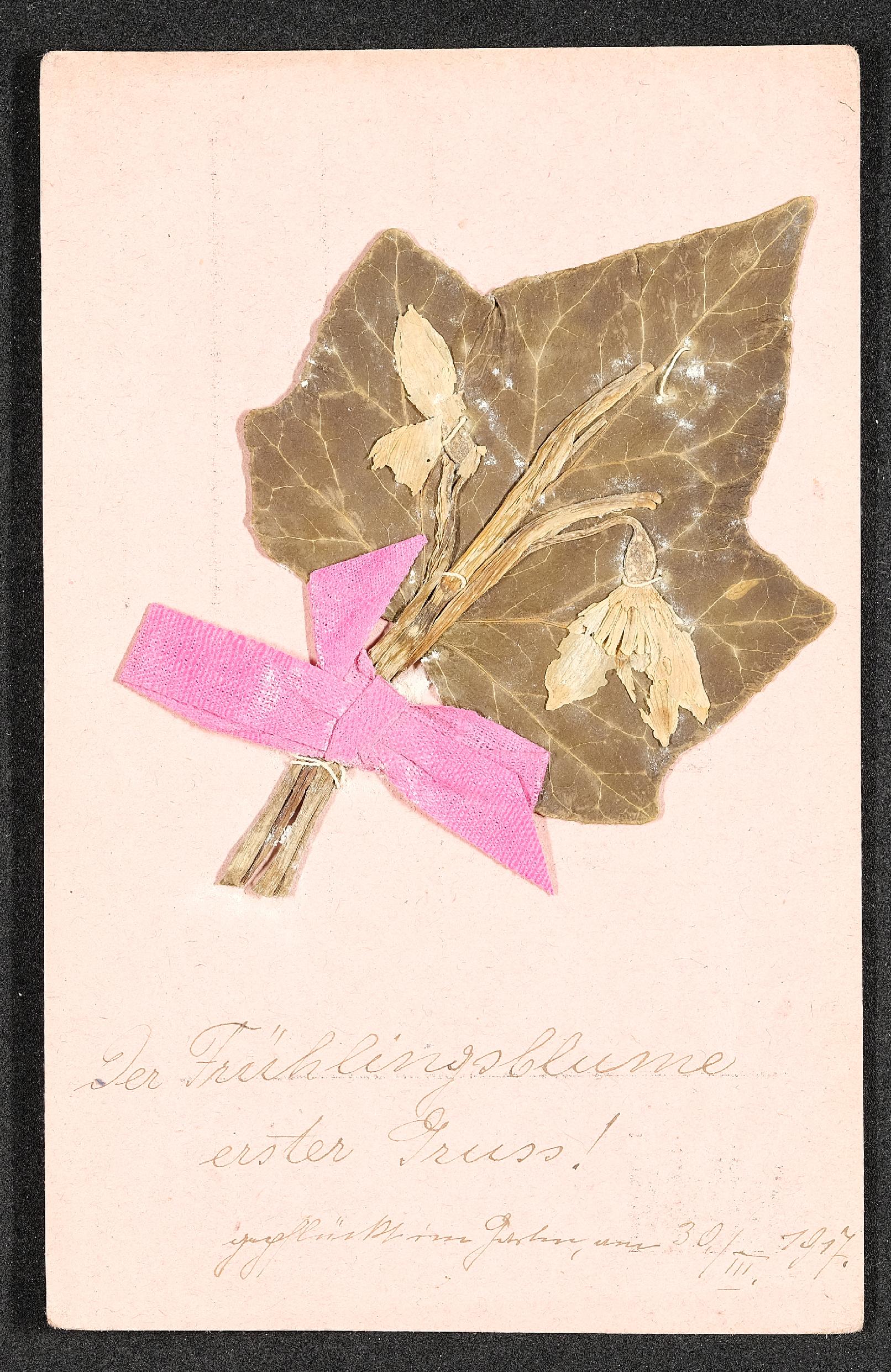 | Beschreibung | Feldpostkorrespondenzkarte mit getrockneter Blume, gepflückt im Garten am 30. März 1917 |