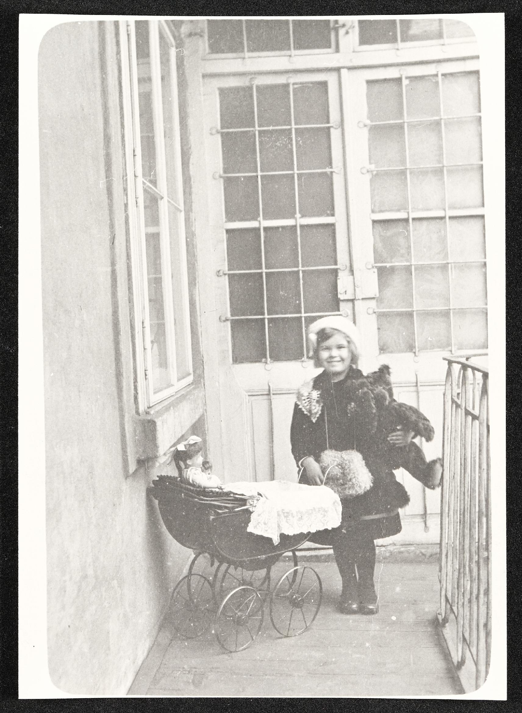| Beschreibung | Kind mit Puppenwagen und Teddybär vor Eingang einer Wohnung |