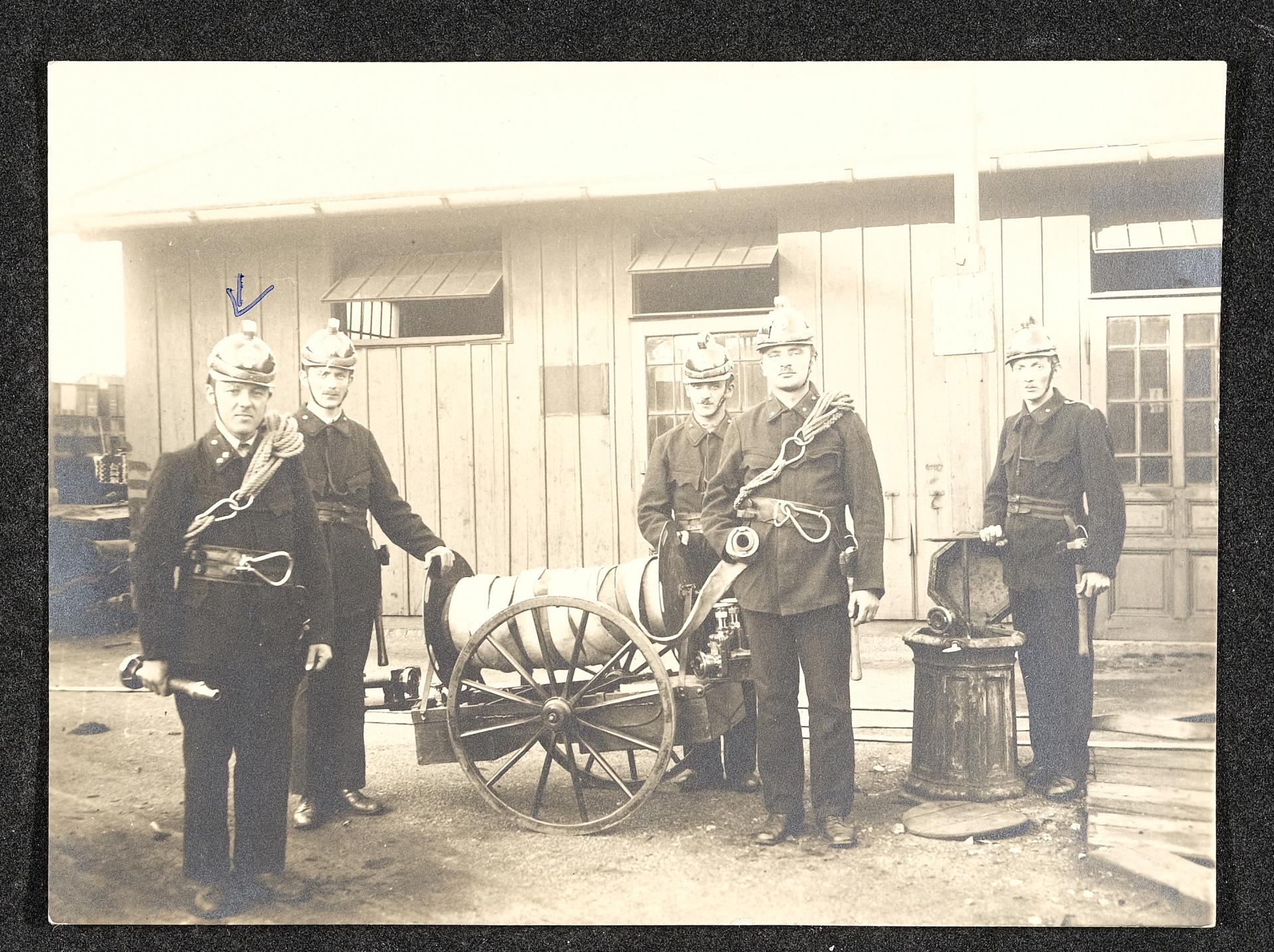 | Beschreibung | Feuerwehrmänner der Feuerwache der Maschinen- und Waggonbau-Fabriks-AG Simmering mit Gustav Seltenhammer |