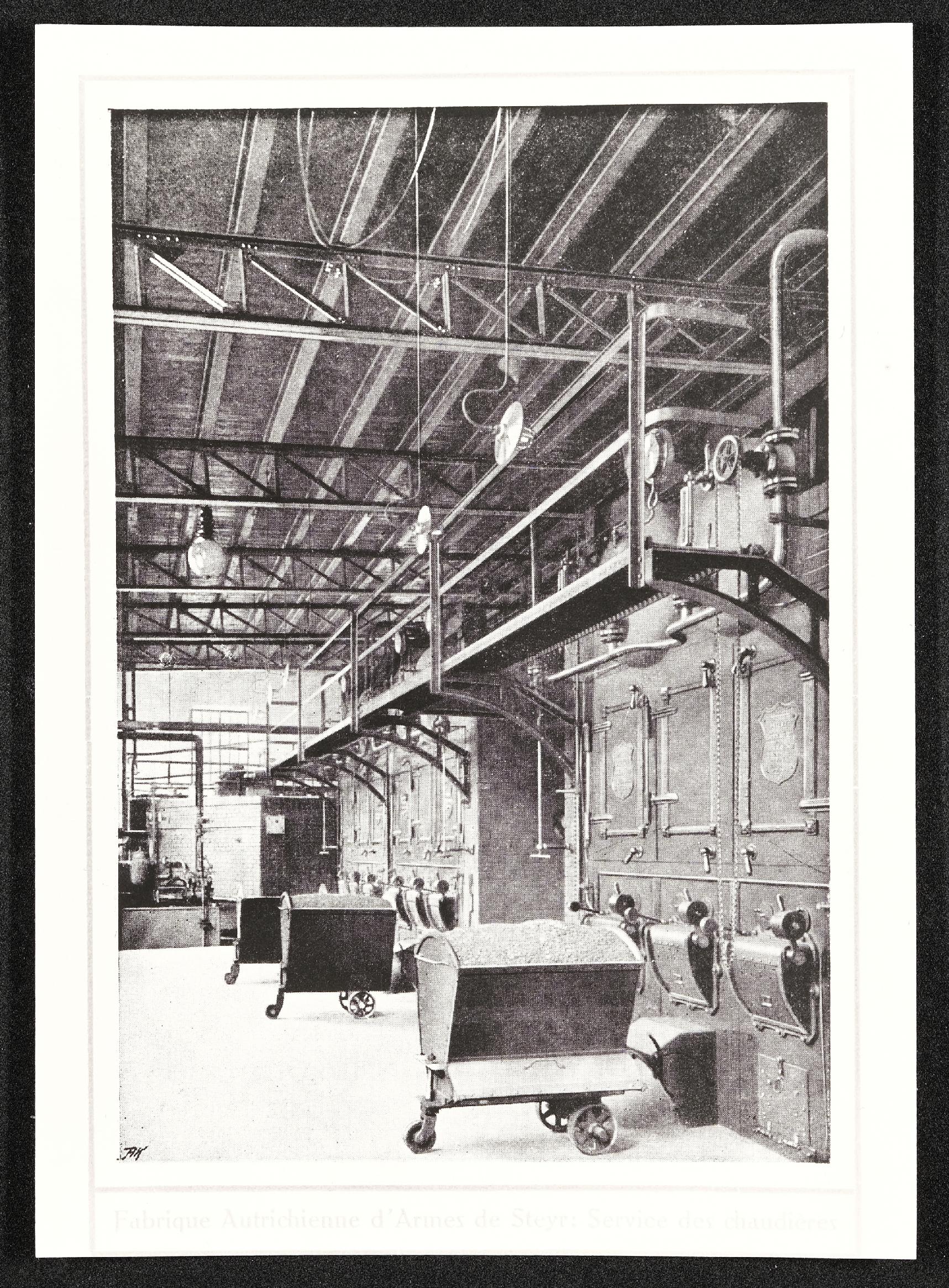 | Beschreibung | Innenaufnahme der Kraftstation mit Dampfkesseln, Objekt XVI der Österreichischen Waffenfabriks-Gesellschaft in Steyr |