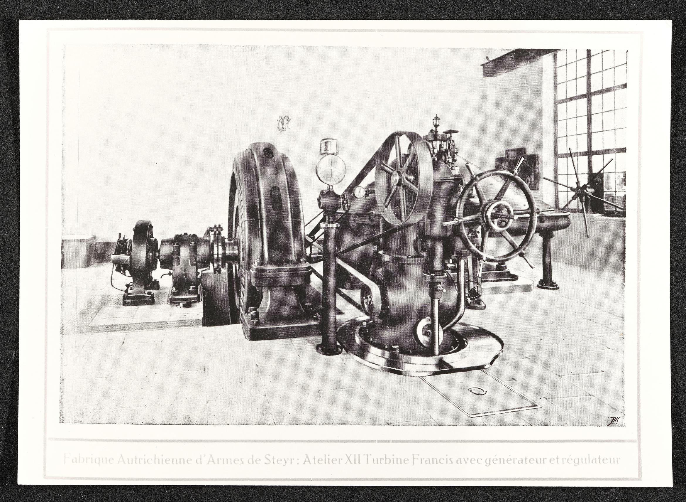 | Beschreibung | Innenaufnahme des Elektrizitätswerks, Objekt XII der Österreichischen Waffenfabriks-Gesellschaft in Steyr, im Bild eine Francis-Turbine mit Generator und Regulator |