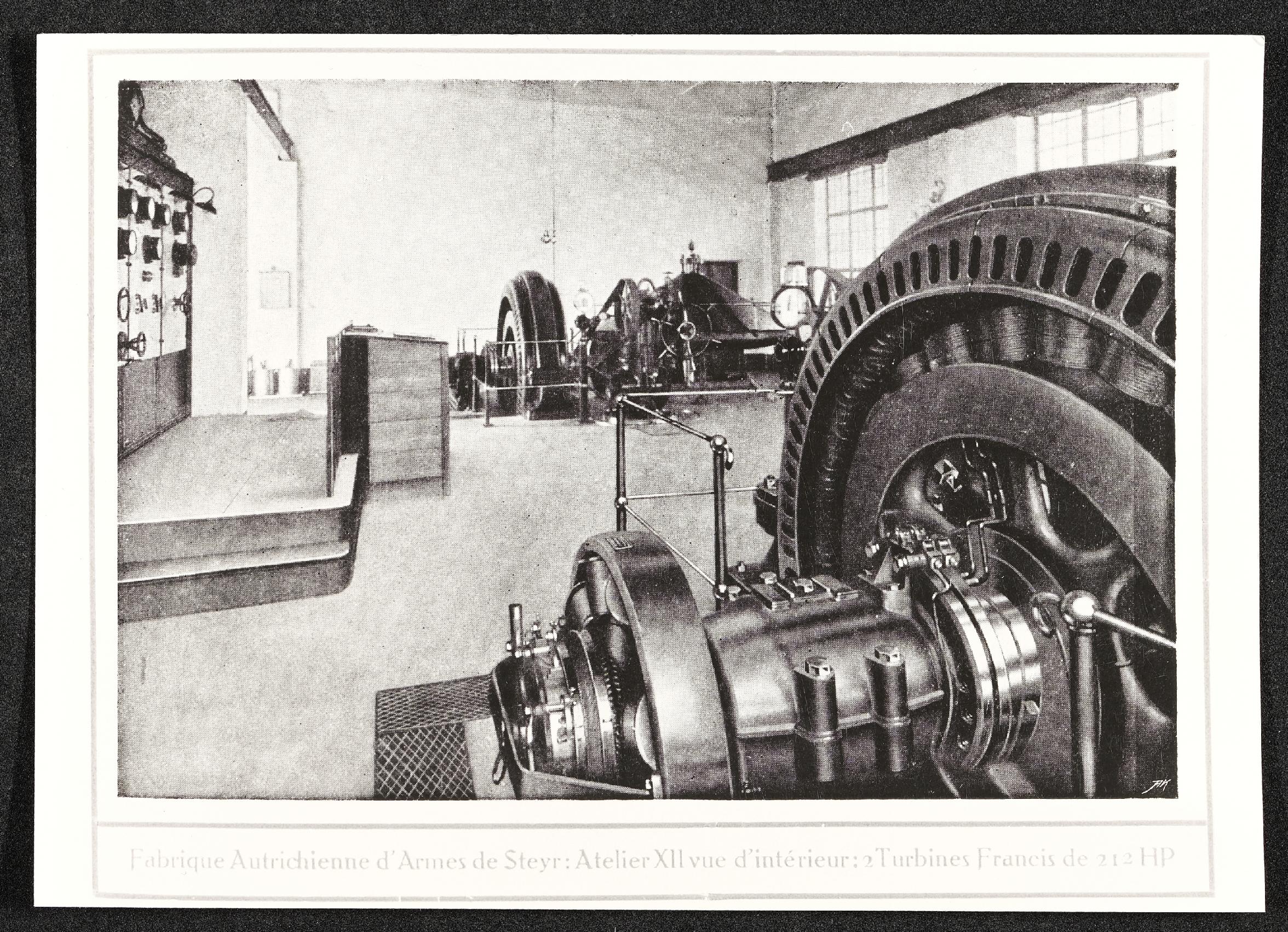 | Beschreibung | Innenaufnahme des Elektrizitätswerks, Objekt XII der Österreichischen Waffenfabriks-Gesellschaft in Steyr, im Bild eine Francis-Turbine mit Generator und Regulator |