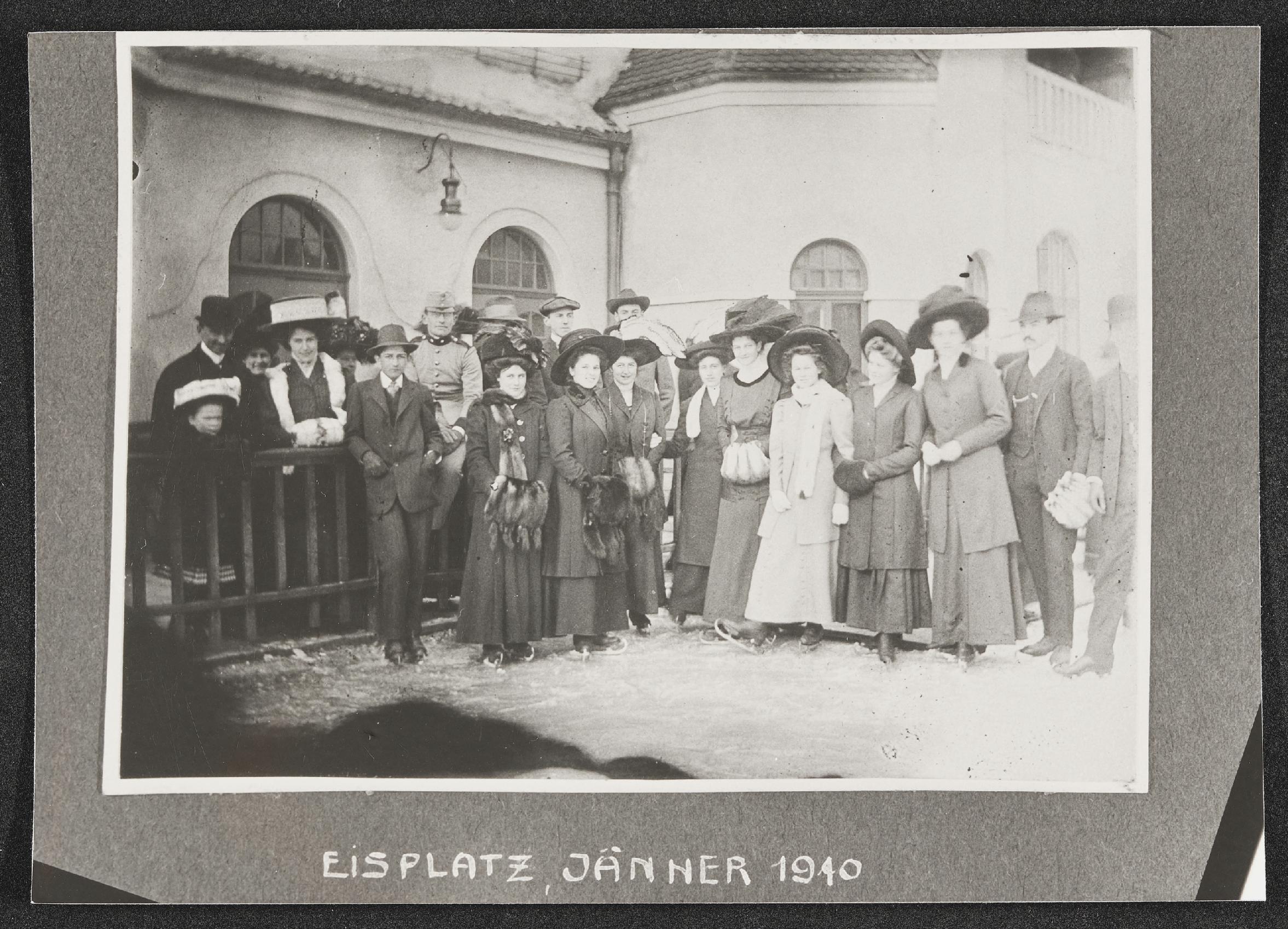 | Beschreibung | Frauen und Männer in Sonntagskleidung und mit Eislaufschuhen auf einem Eislaufplatz in Innsbruck im Jänner 1910 |