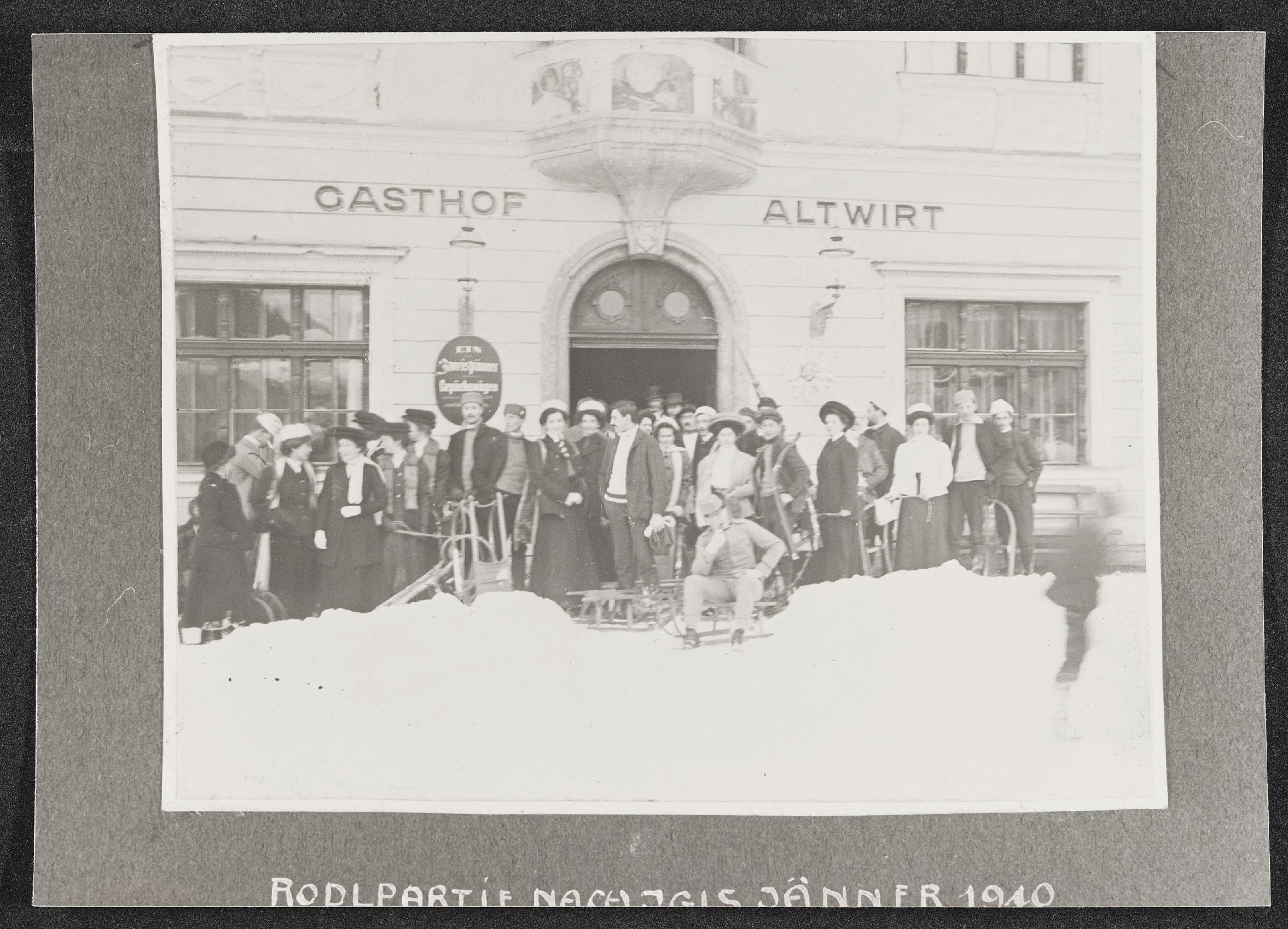 | Beschreibung | Frauen und Männer bei einer Rodlpartie vor dem Gasthof Altwirt in Igls im Jänner 1910 |
