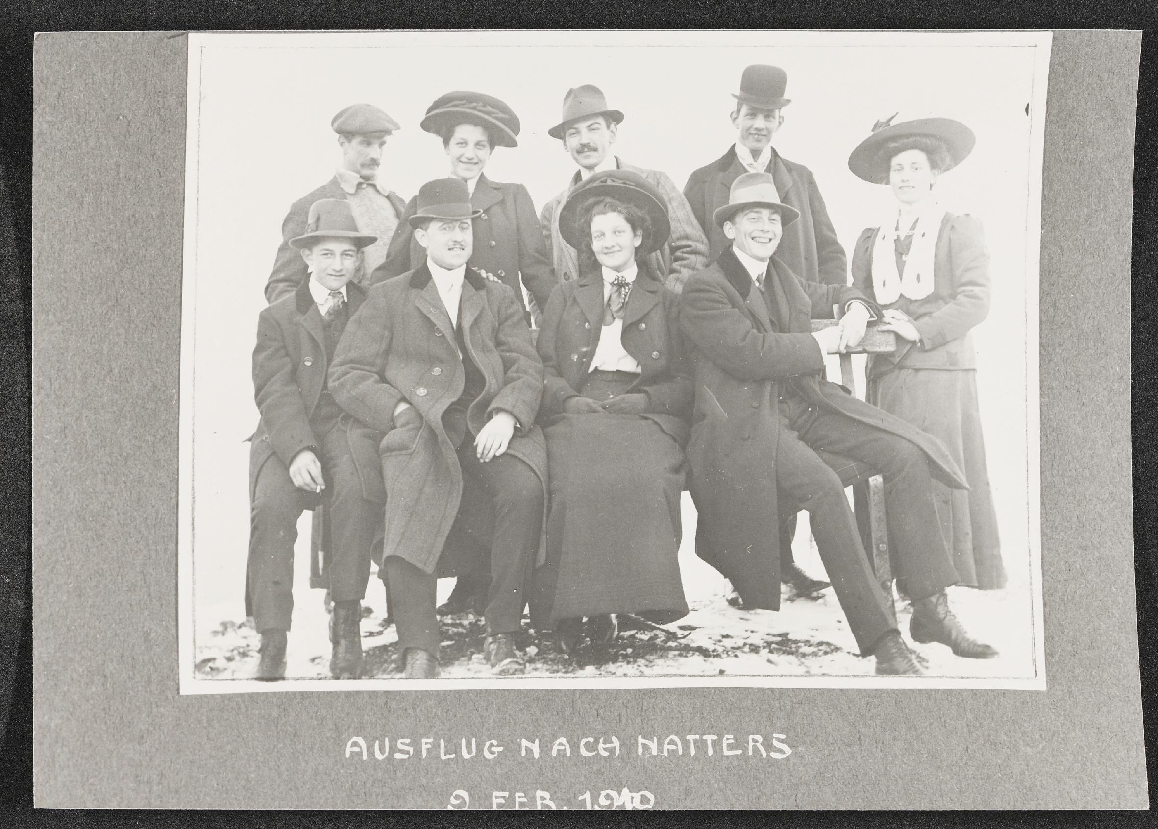 | Beschreibung | Porträt einer bürgerlichen Familie bei einem Ausflug nach Natters am 9. Februar 1910 |