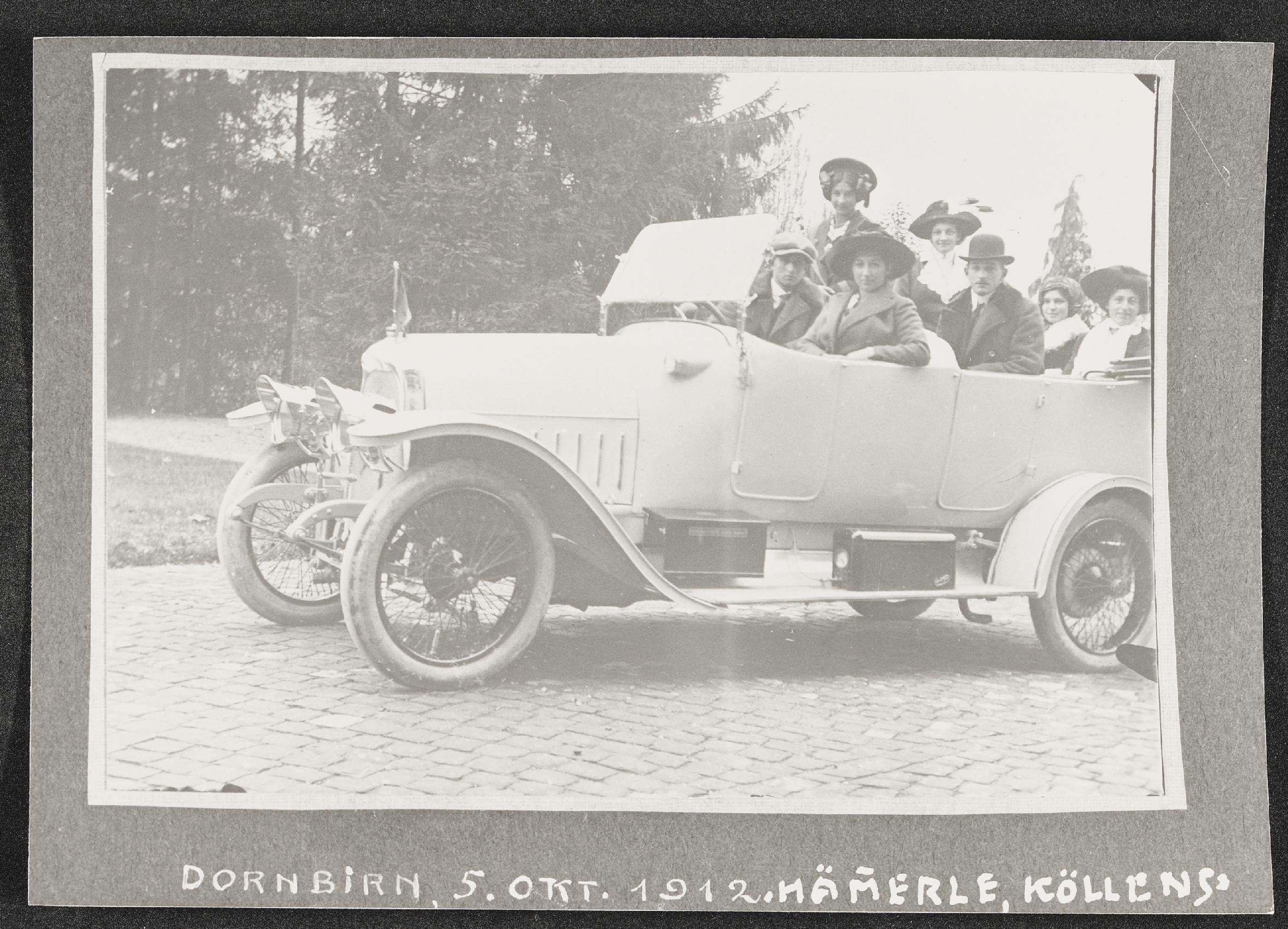 | Beschreibung | Mitglieder der Familie Köllensperger und Hämmerle bei einer gemeinsamen Autofahrt in Dornbirn am 5. Oktober 1912 |