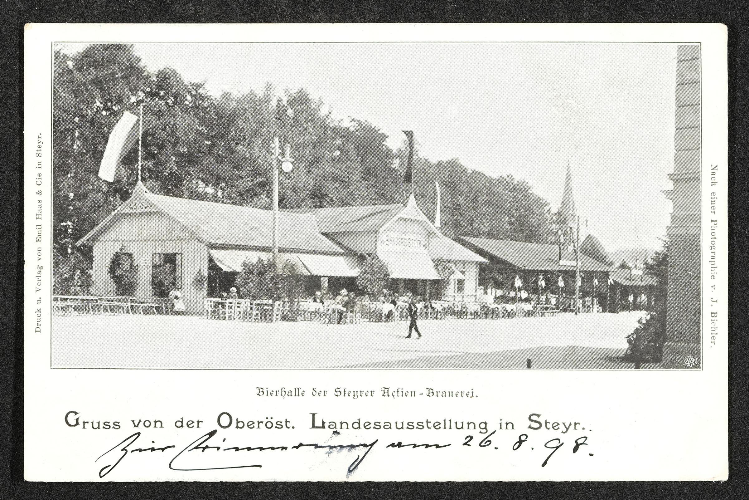 | Beschreibung | Vorderseite der Ansichtskarte "Bierhalle der Steyrer Aktien-Brauerei", Gruss von der Oberösterreichischen Landesausstellung in Steyr, datiert 26. August 1898, Rückseite, Empfänger ist Gustav Gschaider in Steyr |