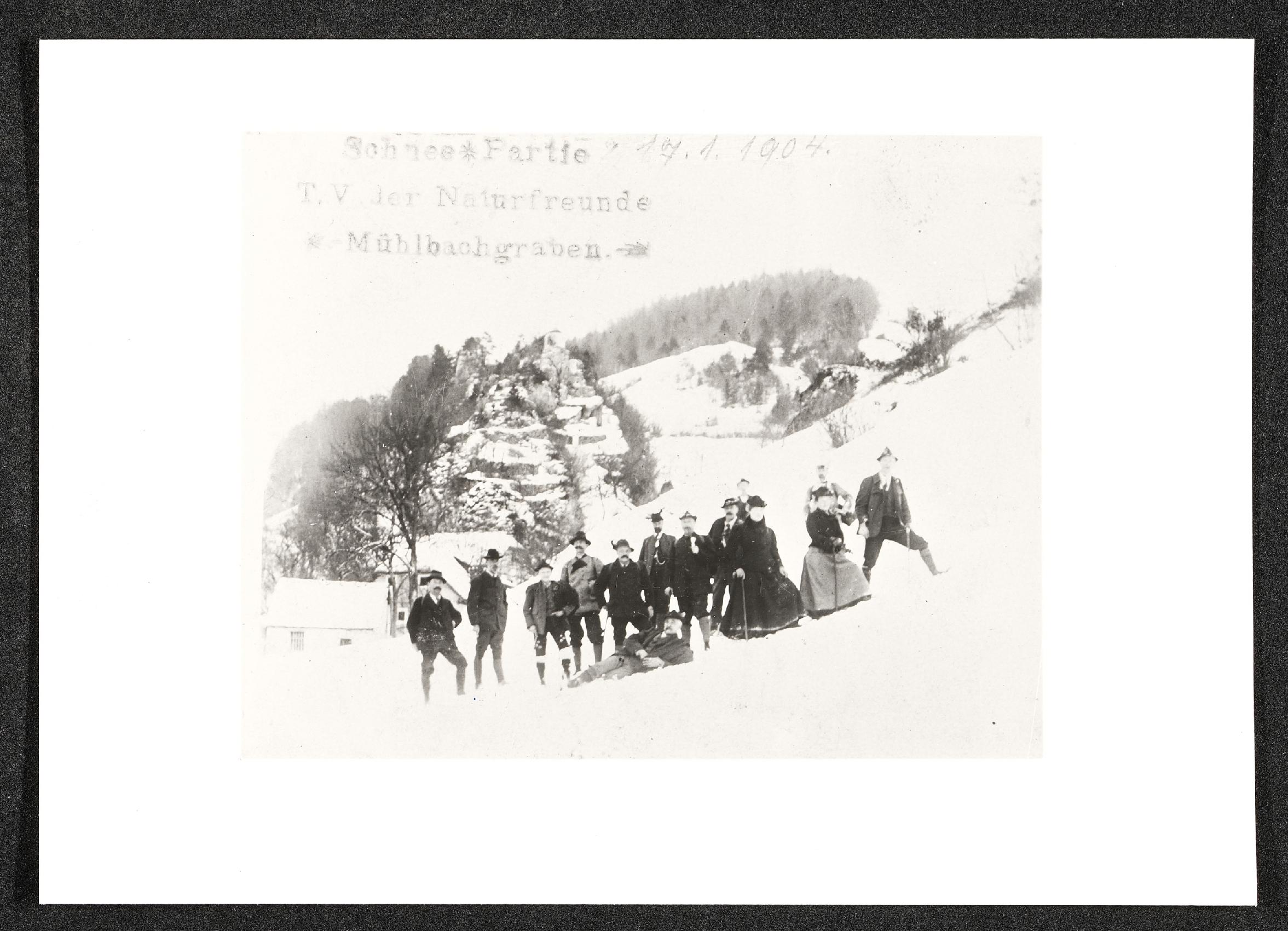 | Beschreibung | Schneepartie der Naturfreunde Mühlbachgraben, Gruppenfoto mit Frauen in Kleidern und Männern im Schnee, 17. Jänner 1904, abgedruckt im Katalog Arbeit, Mensch, Maschine Seite 260 |