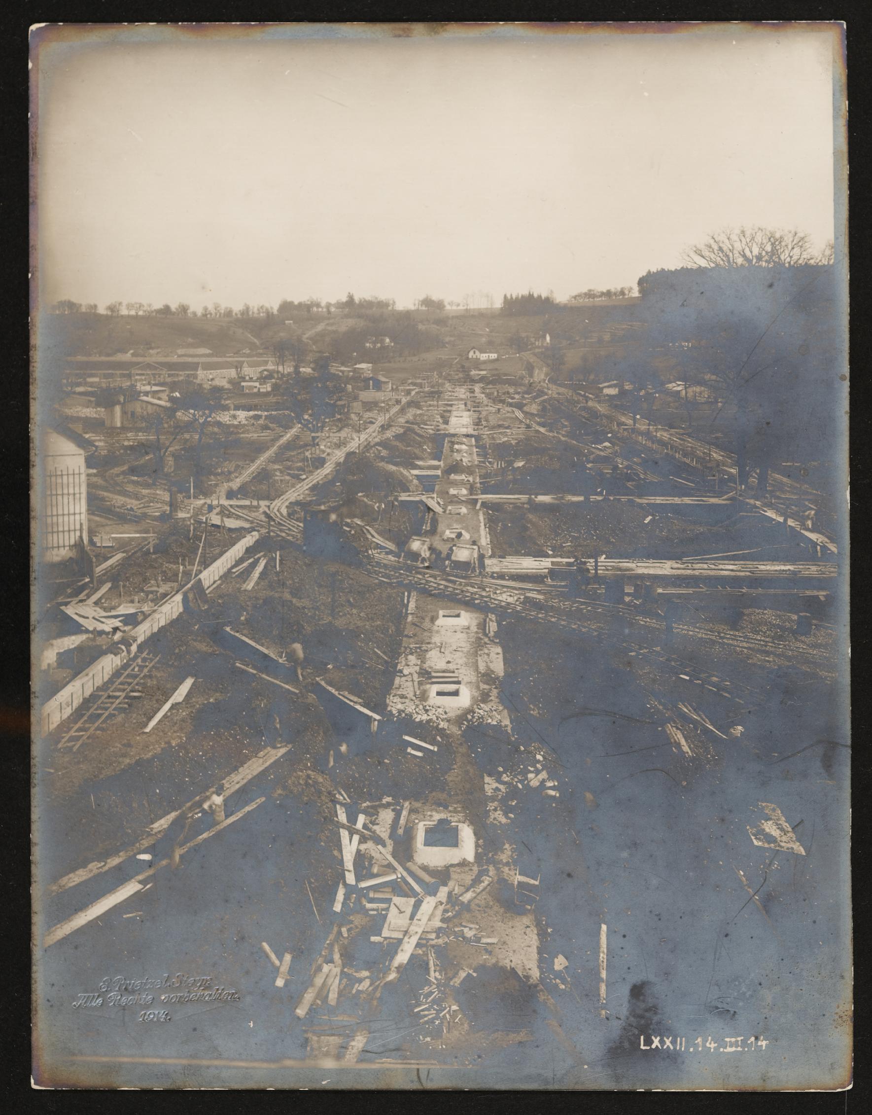 | Beschreibung | Neubau der Waffenfabrik, Steyr, Ennsleite, Aufnahme vom 14. März 1914, Österreichische Waffen-Fabriksgesellschaft, inkl. Schienennetz |