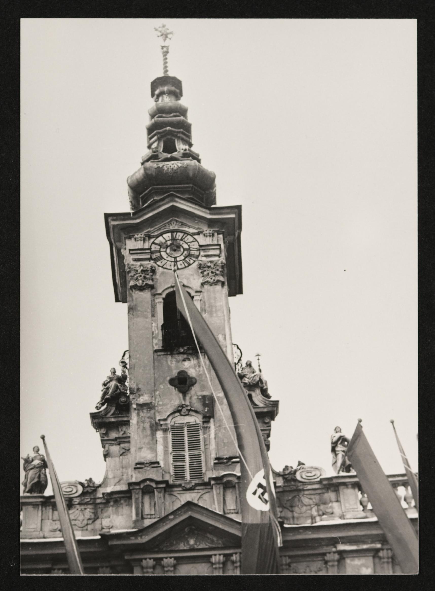 | Beschreibung | Rathausturm von Steyr mit Hakenkreuzfahne nach dem Anschluss, März 1938 |