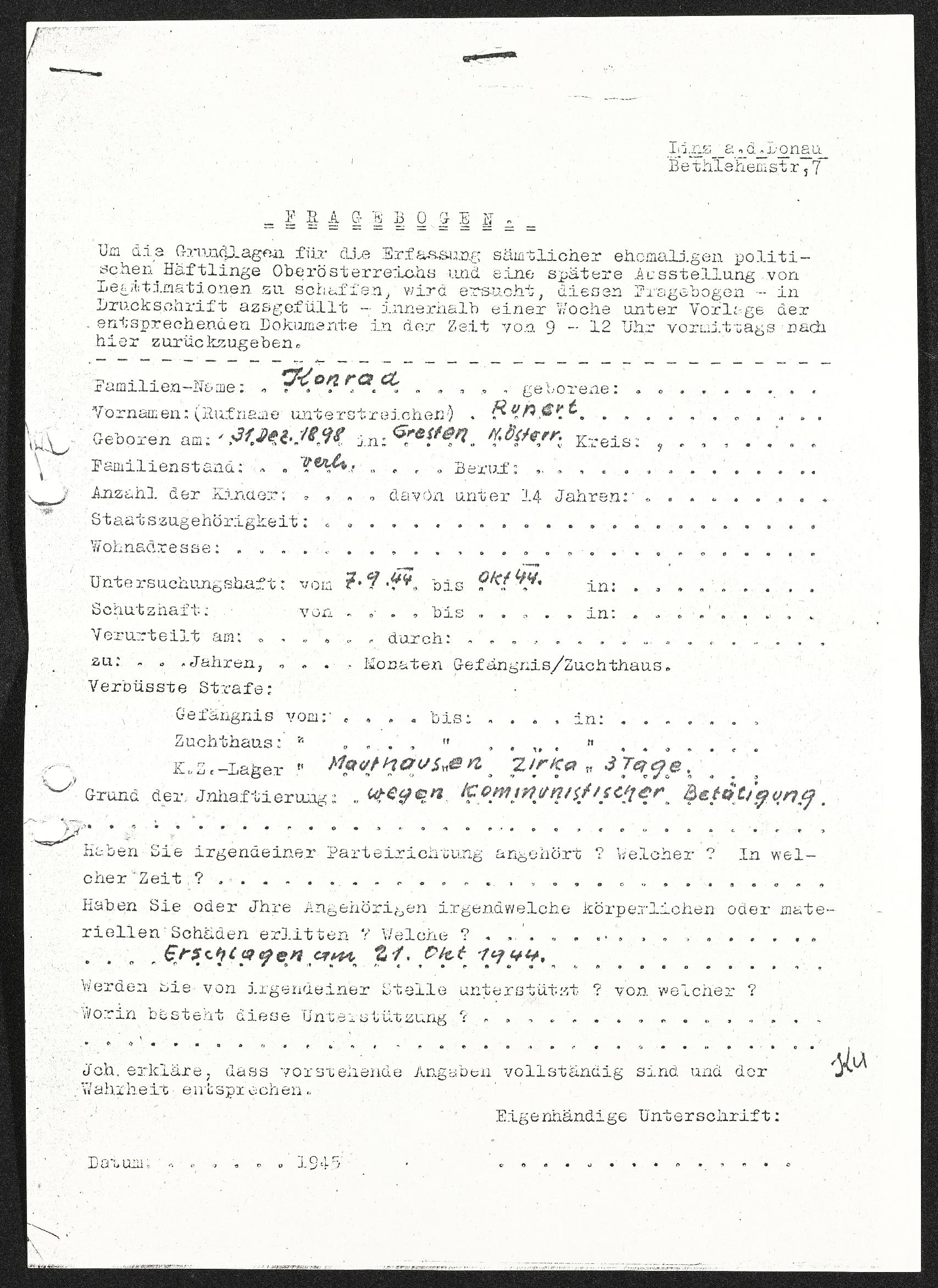 | Beschreibung | Fragebogen zur Erfassung ehemaliger politischer Häftlinge, Rupert Konrad, geboren am 31. Dezember 1898, Untersuchungshaft 7. September 1944 bis Oktober 1944, drei Tage im Konzentrationslager Mauthausen, wegen kommunistischer Betätigung, erschlagen am 21. Oktober 1944 |