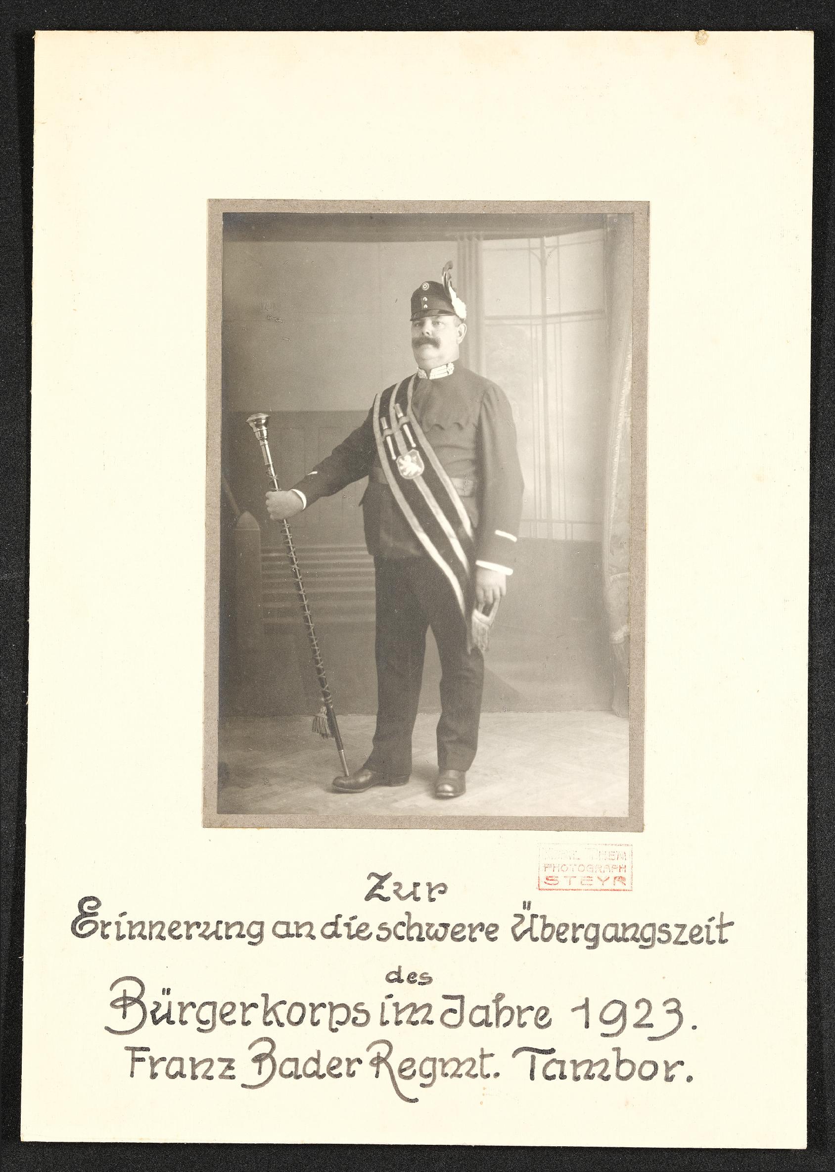 | Beschreibung | Porträt von Franz Bader, Regimentstambour des Bürgerkorps Steyr |