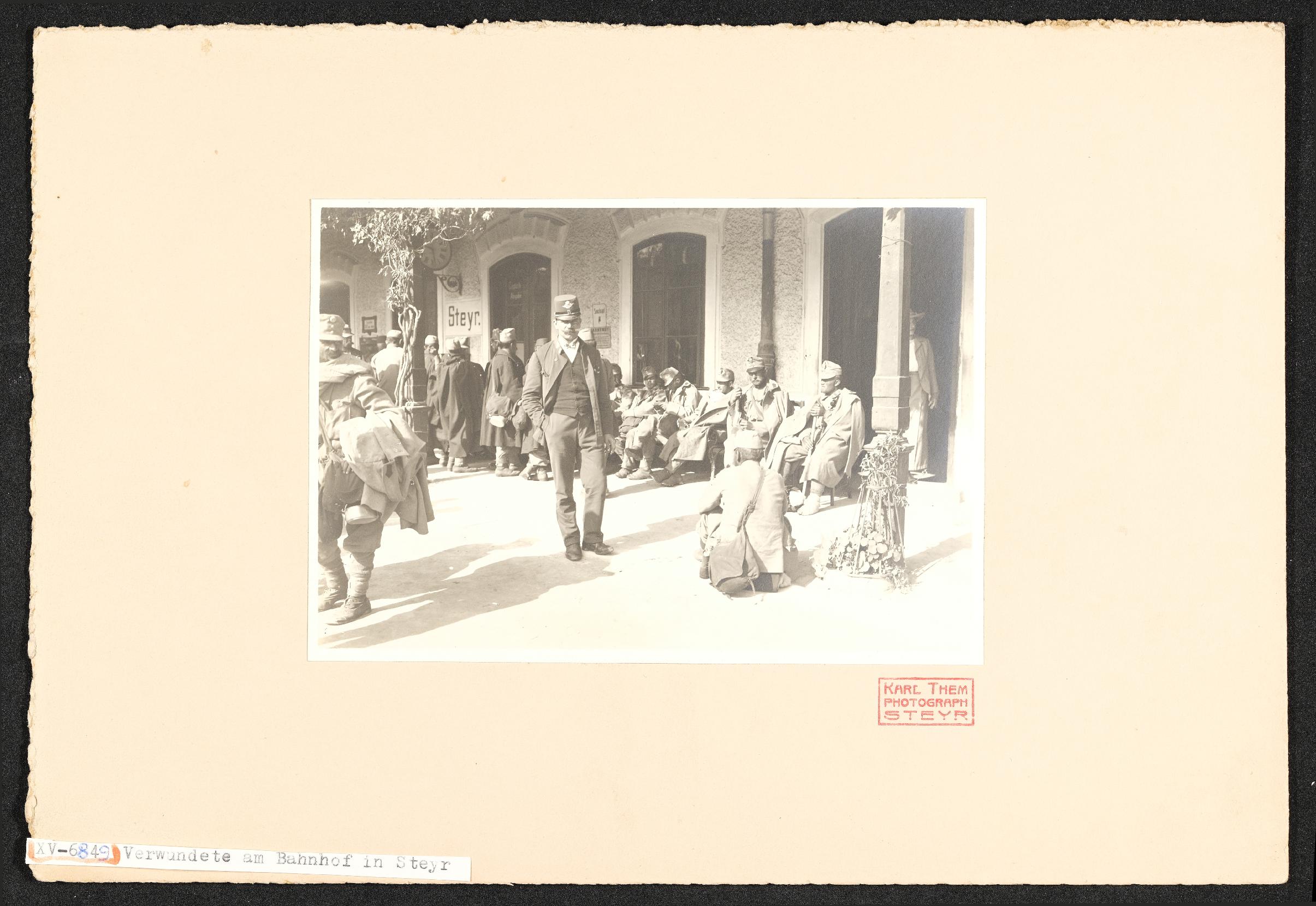 | Beschreibung | Ankunft des ersten Verwundetetentransports von der russischen Front am Bahnhof Steyr |