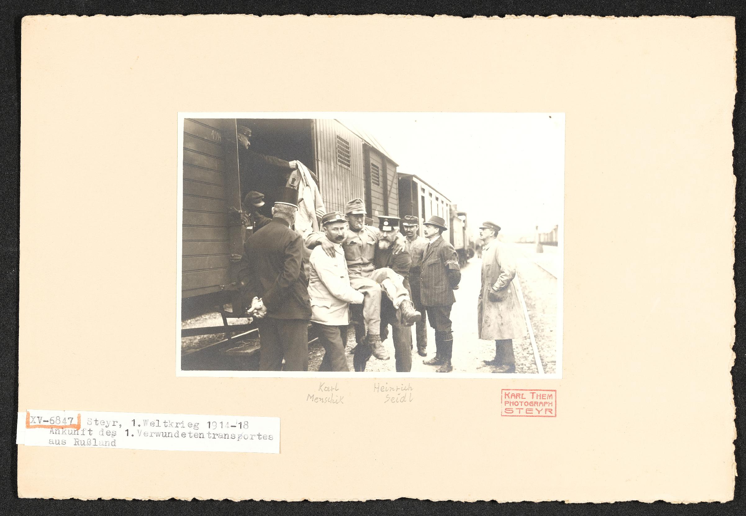 | Beschreibung | Ankunft des ersten Verwundetetentransports von der russischen Front am Bahnhof Steyr |