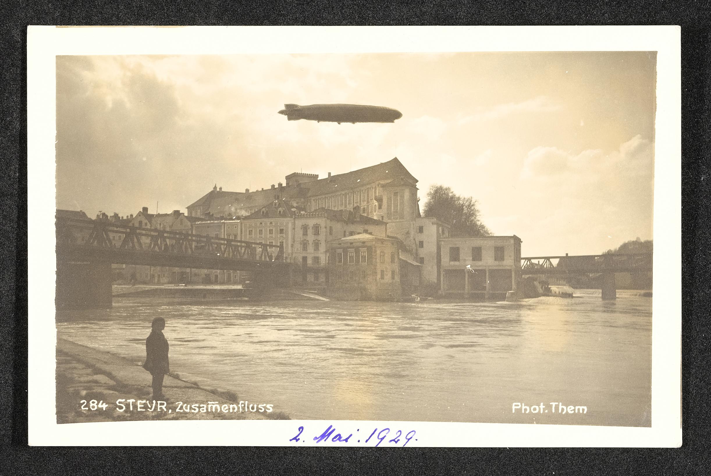 | Beschreibung | Zeppelin über Zwischenbrücken und Schloss Lamberg in Steyr am Zusammenfluss von Enns und Steyr am 2. Mai 1929 |