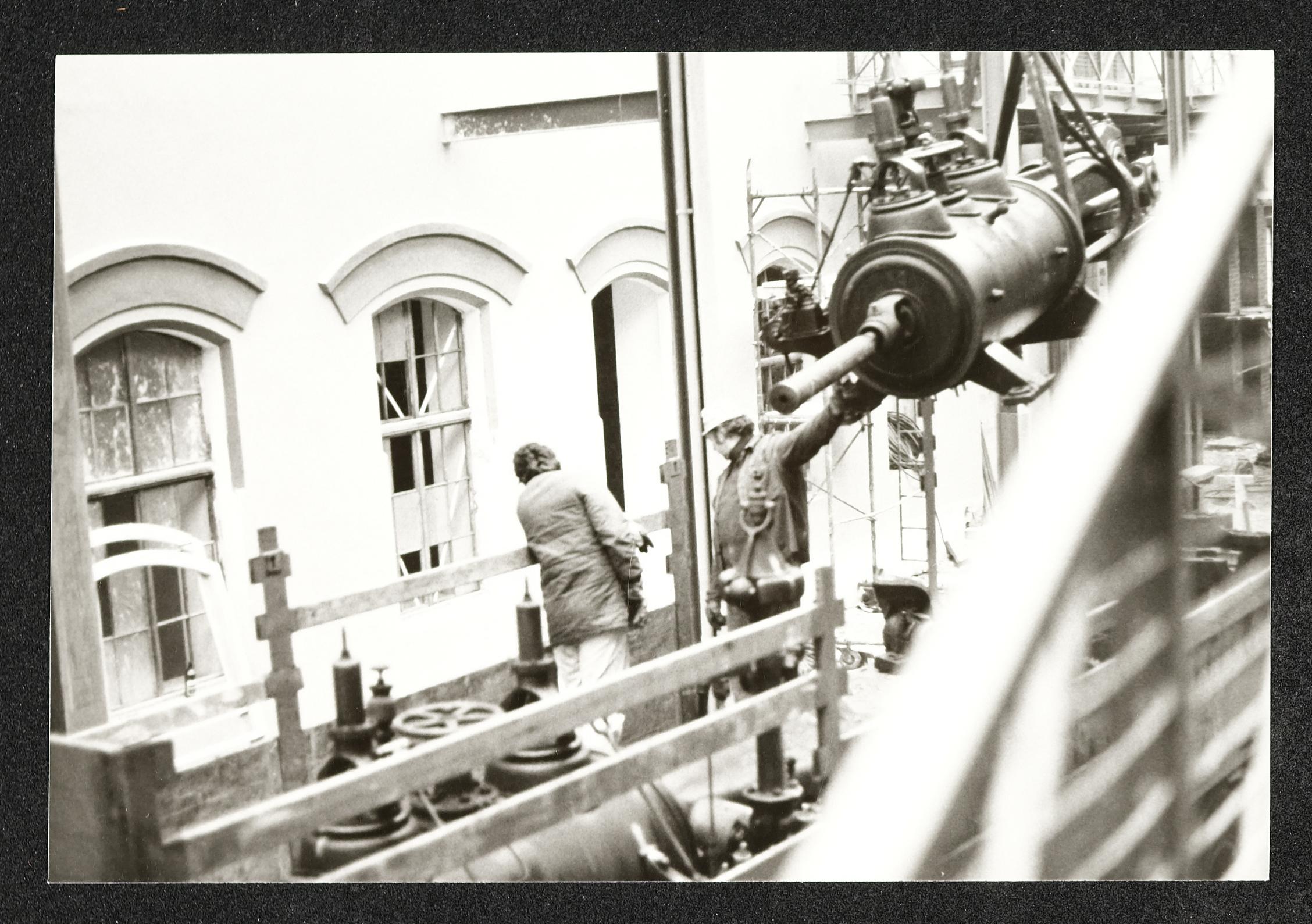 | Beschreibung | Abladen der Dampfmaschine für die Montage im Foyer des Museum Arbeitswelt Steyr |