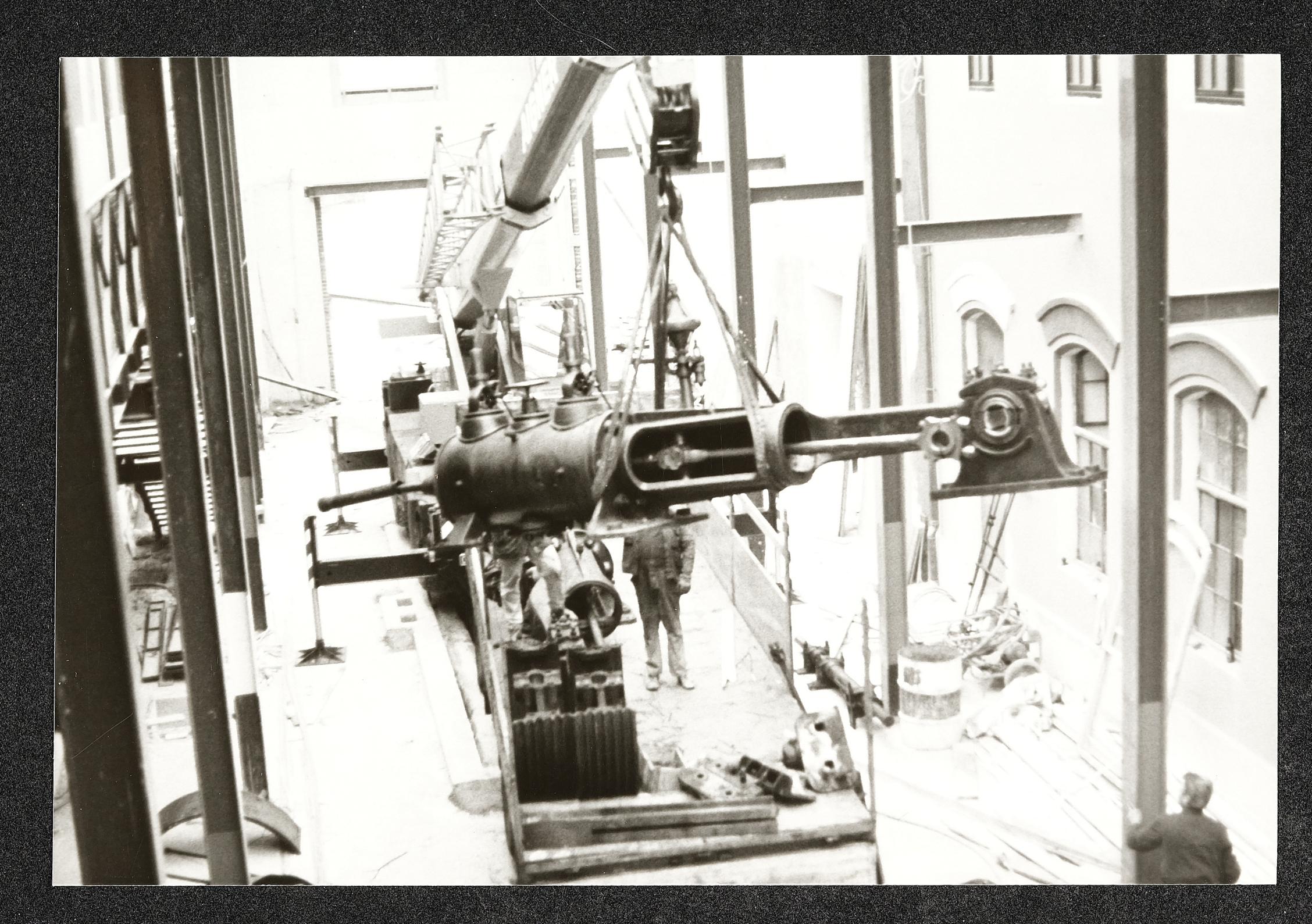 | Beschreibung | Abladen der Dampfmaschine für die Montage im Foyer des Museum Arbeitswelt Steyr |