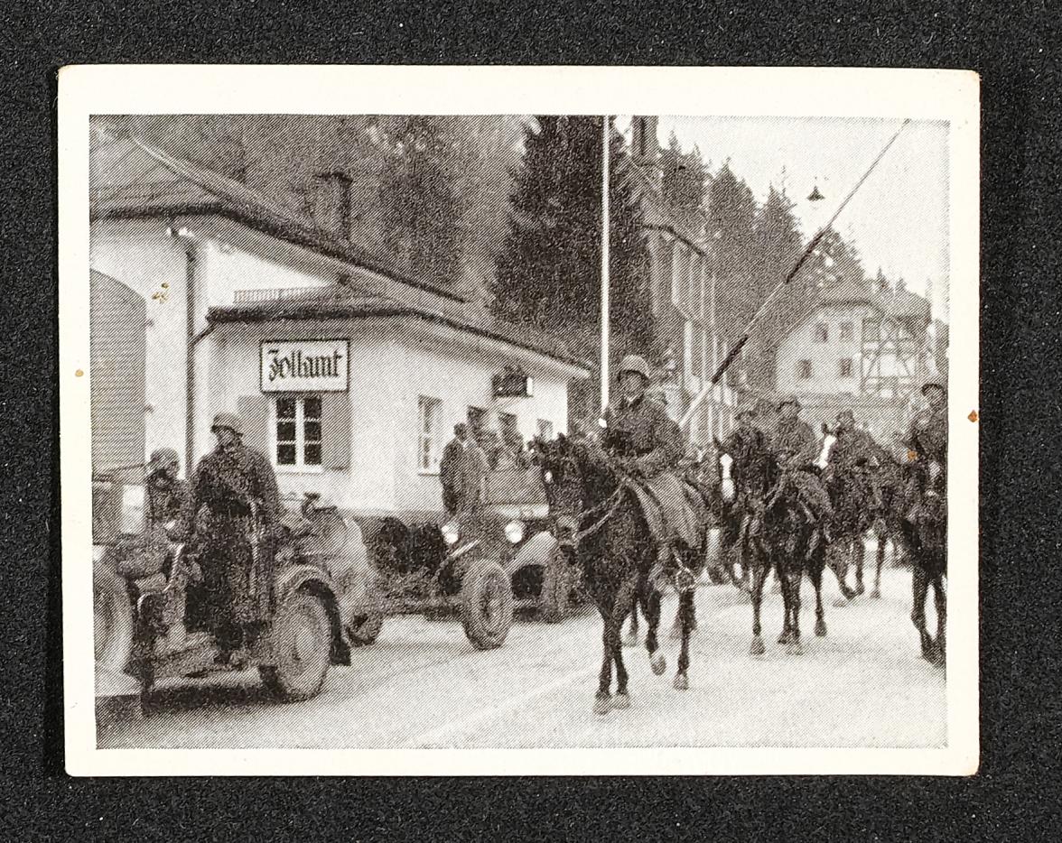 | Beschreibung | Sammelbild Nr. 177 Die Zollschranken in Kiefersfelden werden geöffnet, die deutschen Truppen ziehen ein. Sammelbilder (in Zigarettenpackungen enthalten) und Sammelband (Adolf Hitler und sein Weg zu Großdeutschland) erhältlich in jeder Tabaktrafik. |
