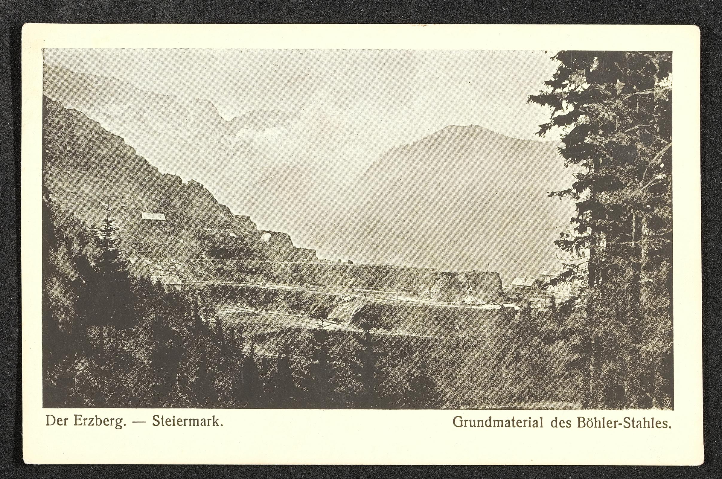 | Beschreibung | Werbeansichtskarte der Gebrüder Böhler & Co AG. Motiv: Der Erzberg in der Steiermark liefert das Grundmaterial des Böhlerstahles. |