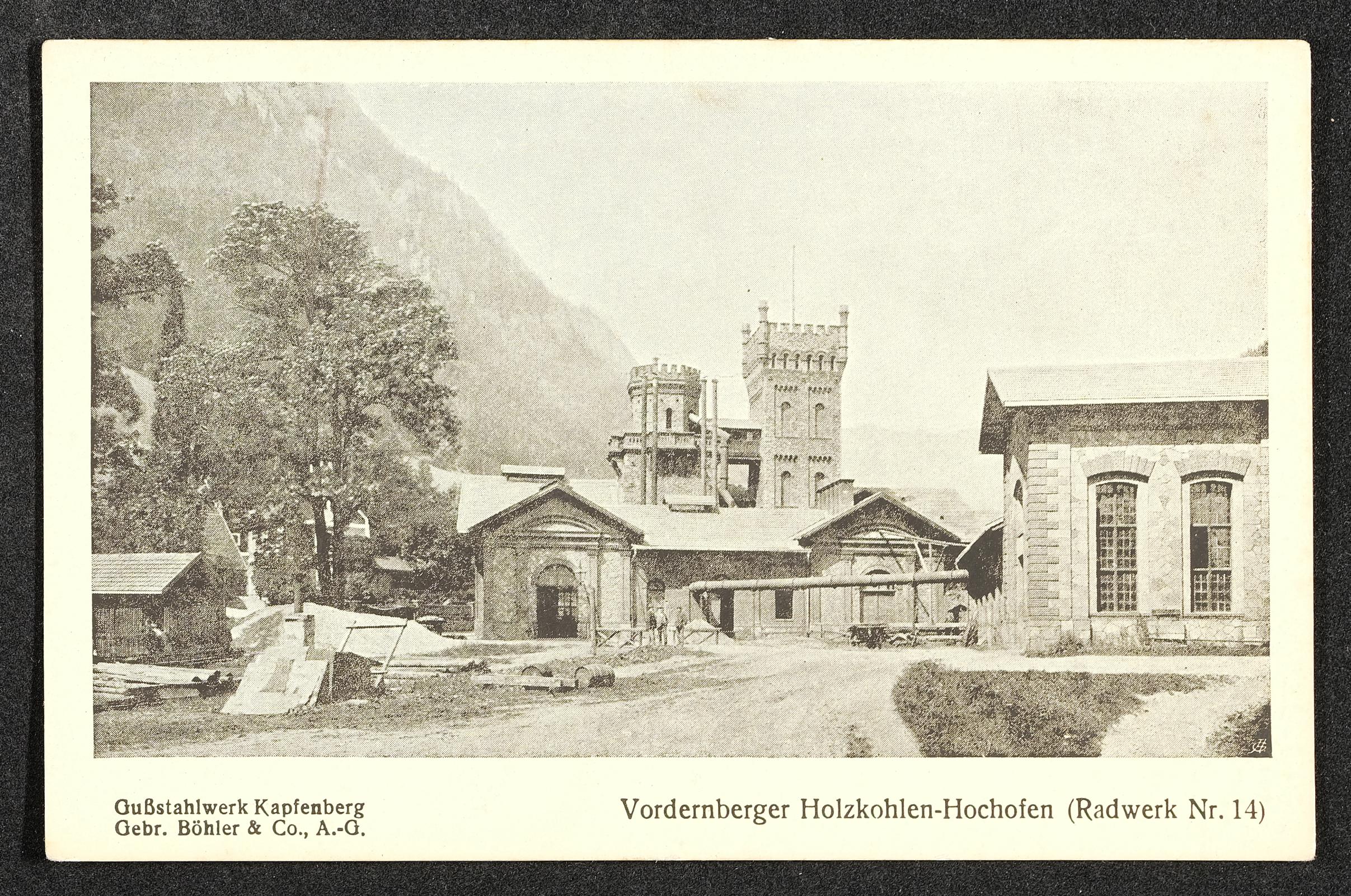 | Beschreibung | Werbeansichtskarte der Gebrüder Böhler & Co AG. Motiv: Vordernberger Holzkohlen-Hochofen (Radwerk Nr. 14) |