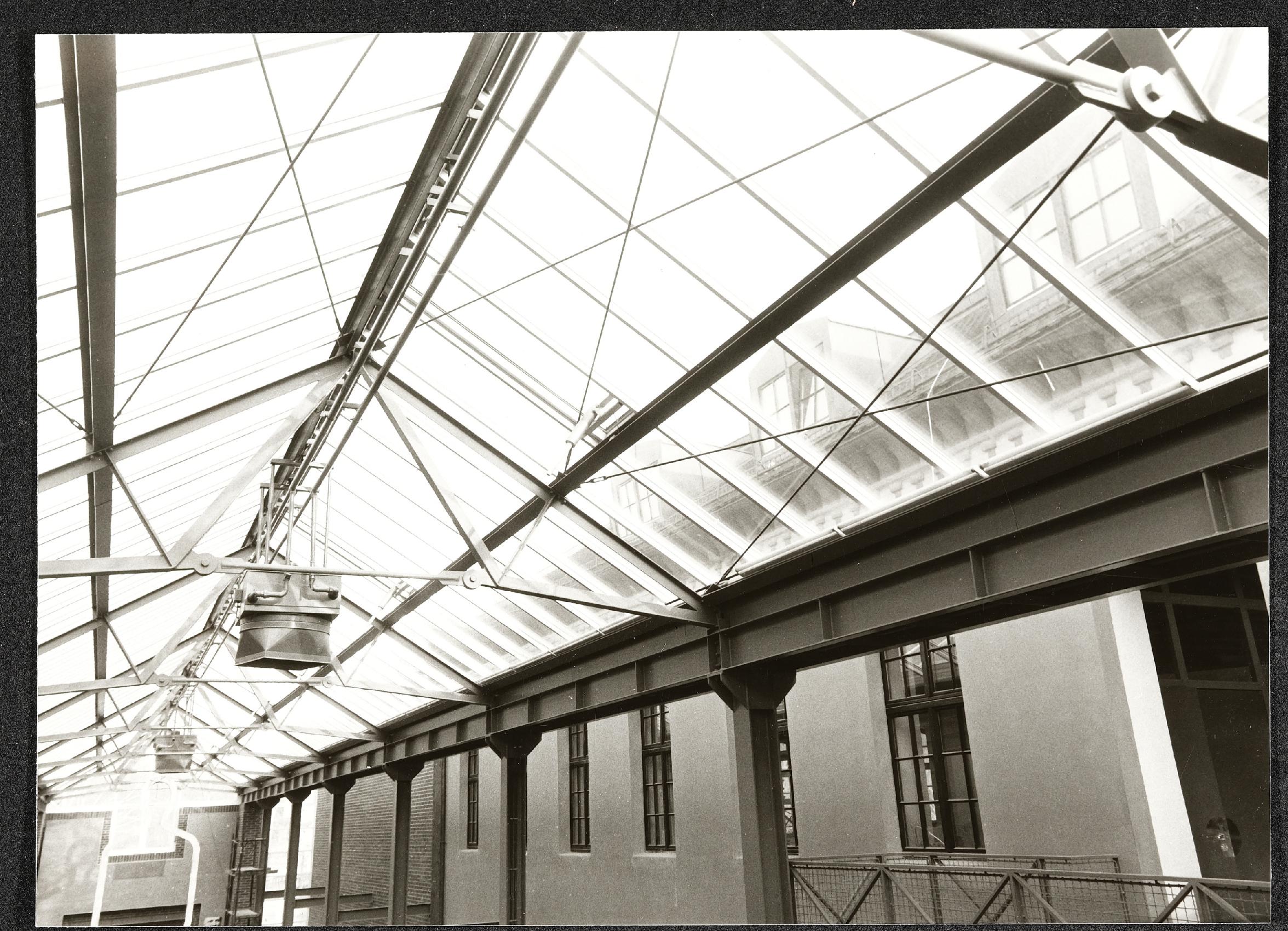 | Beschreibung | Innenansicht während des Aufbaus für die Landesausstellung 1987 "Arbeit Mensch Maschine", Glasdachkonstruktion in der Mittelhalle des Museum Industrielle Arbeitswelt Steyr |