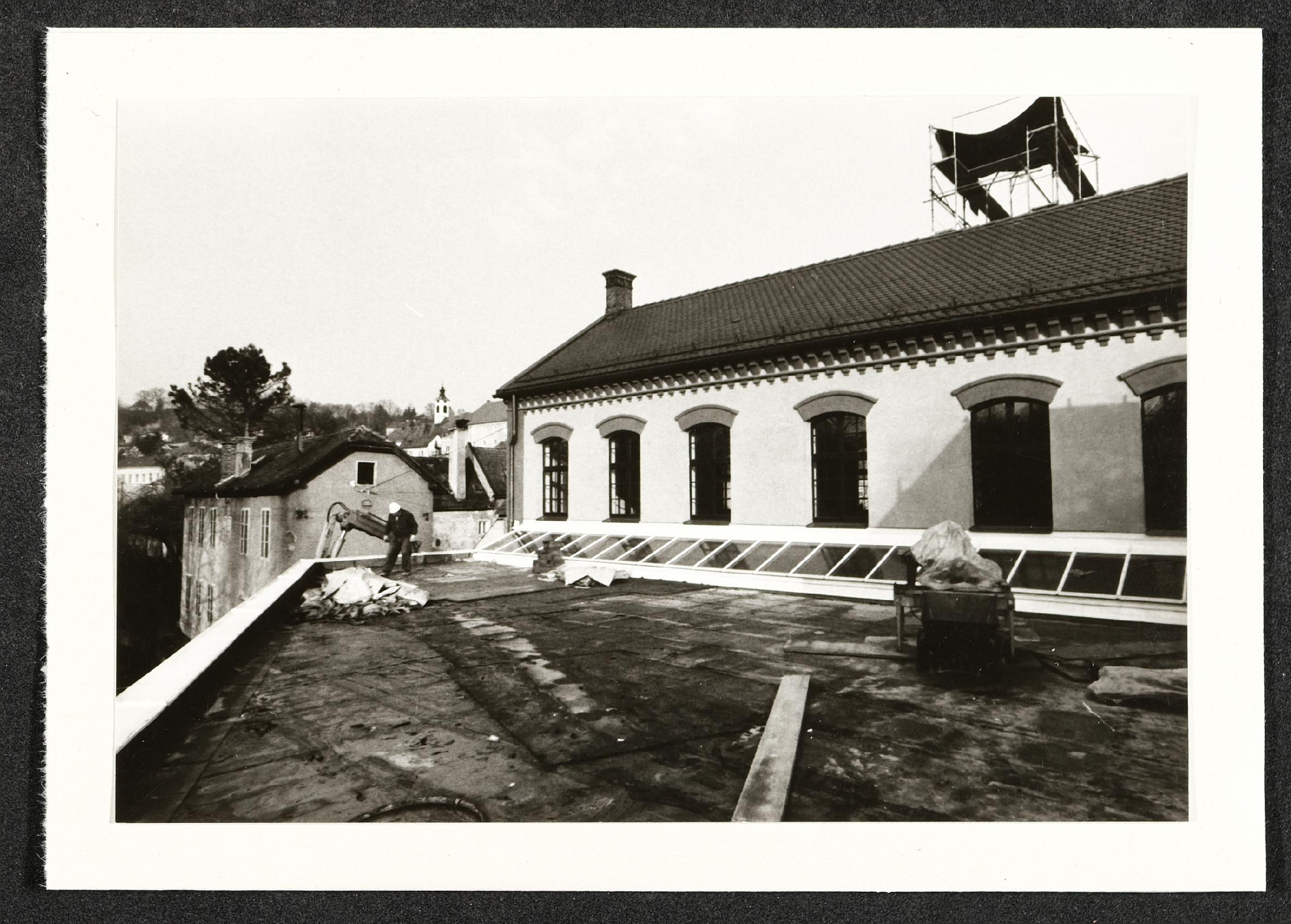 | Beschreibung | Bauarbeiten für die Landesausstellung 1987 "Arbeit - Mensch - Maschine" im Museum Industrielle Arbeitswelt Steyr: Dach, Kamine |