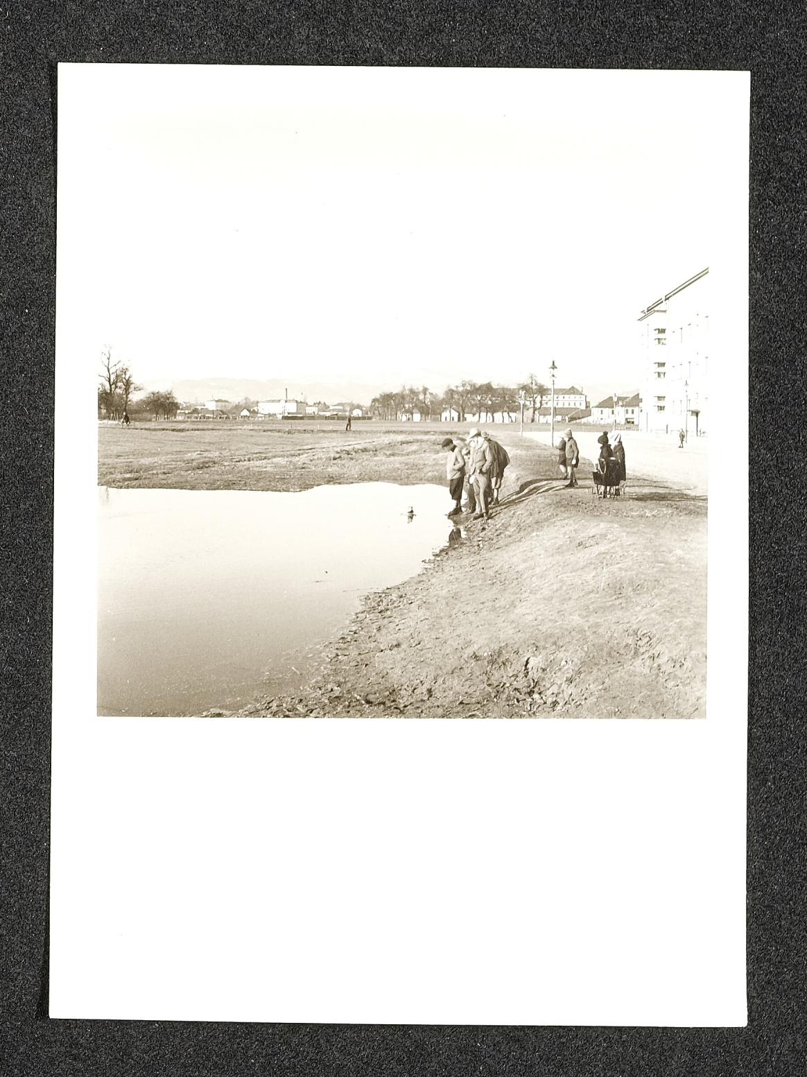 | Titel | Menschengruppe bei einem Teich |