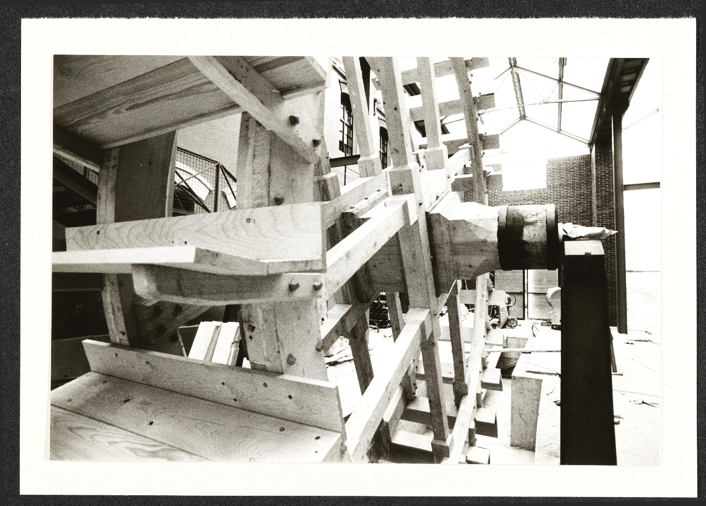| Beschreibung | Aufbauarbeiten für die Landesausstellung 1987 "Arbeit - Mensch - Maschine" im Museum Industrielle Arbeitswelt Steyr: Mittelhalle, Wasserrad |